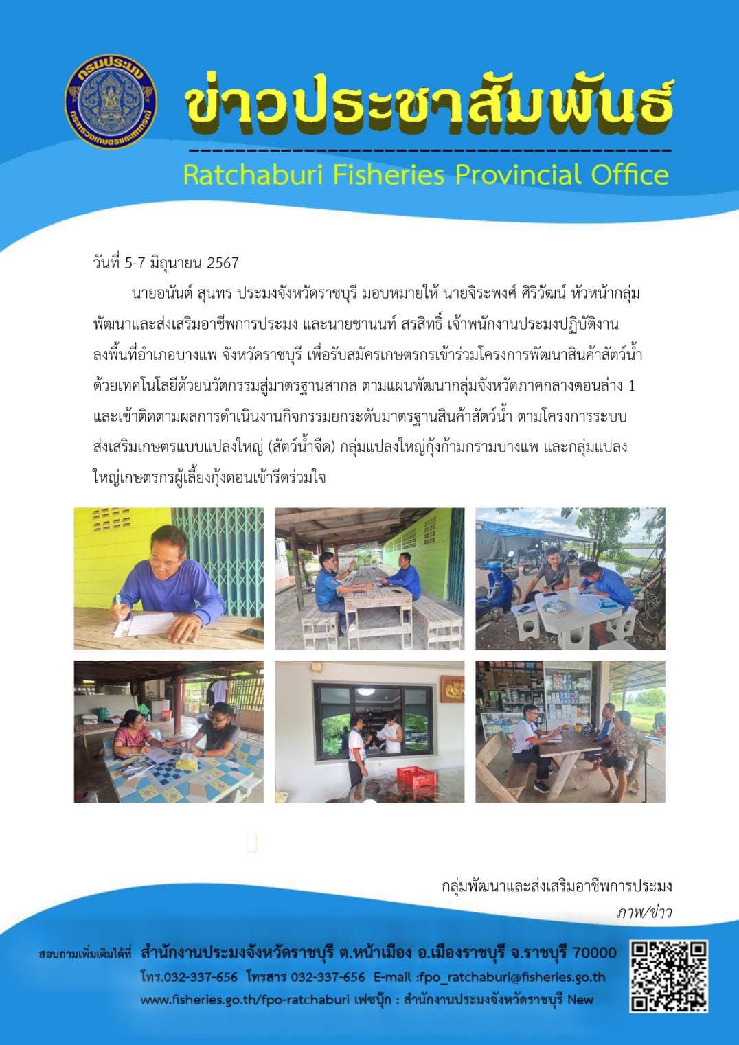 วันที่ 5-7 มิถุนายน 2567 นายอนันต์ สุนทร ประมงจังหวัดราชบุรี มอบหมายให้ นายจิระพงศ์ ศิริวัฒน์ หัวหน้ากลุ่มพัฒนาและส่งเสริมอาชีพการประมง และนายชานนท์ สรสิทธิ์ เจ้าพนักงานประมงปฏิบัติงาน ลงพื้นที่อำเภอบางแพ จังหวัดราชบุรี เพื่อรับสมัครเกษตรกรเข้าร่วมโครงการพัฒนาสินค้าสัตว์น้ำด้วยเทคโนโลยีด้วยนวัตกรรมสู่มาตรฐานสากล ตามแผนพัฒนากลุ่มจังหวัดภาคกลางตอนล่าง 1 และเข้าติดตามผลการดำเนินงานกิจกรรมยกระดับมาตรฐานสินค้าสัตว์น้ำ ตามโครงการระบบส่งเสริมเกษตรแบบแปลงใหญ่ (สัตว์น้ำจืด) กลุ่มแปลงใหญ่กุ้งก้ามกรามบางแพ และกลุ่มแแลงใหญ่เกษตรกรผู้เลี้ยงกุ้งดอนเข้ารีดร่วมใจ