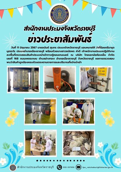 วันที่ 11 มิถุนายน 2567 นายอนันต์ สุนทร ประมงจังหวัดราชบุรี มอบหมายให้ ว่าที่ร้อยตรีมารุต นุตตะโร ประมงอำเภอเมืองราชบุรี พร้อมด้วย นางสาวธนัชพร คำดี เจ้าพนักงานประมงปฏิบัติงาน ลงพื้นที่ตรวจสอบสินค้าประมงนำเข้าทางตู้คอนเทนเนอร์ ณ บริษัท ไทยเอกมัยห้องเย็น จำกัด เลขที่ 168 ถนนเพชรเกษม ตำบลอ่างทอง อำเภอเมืองราชบุรี จังหวัดราชบุรี ผลการตรวจสอบพบว่าสินค้าถูกต้องครบถ้วนตรงตามรายการและปริมาณที่แจ้งนำเข้า