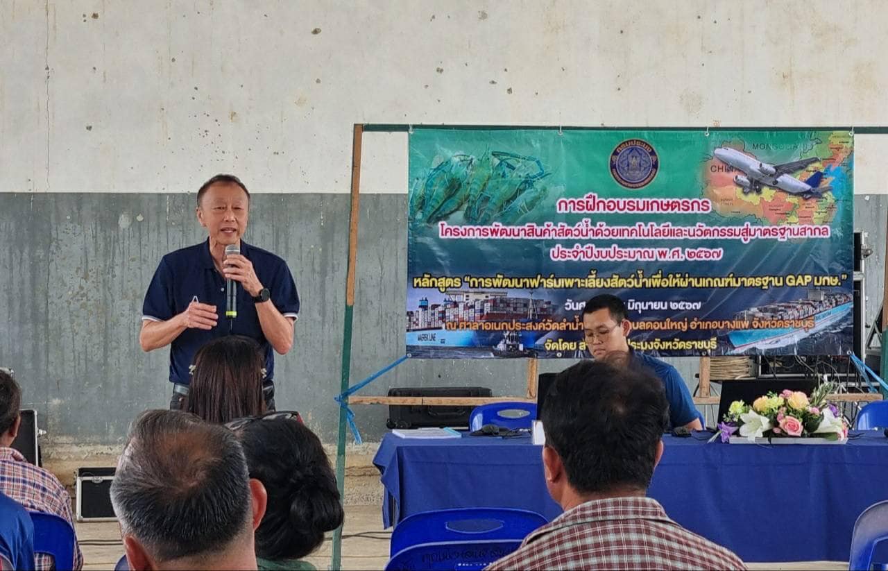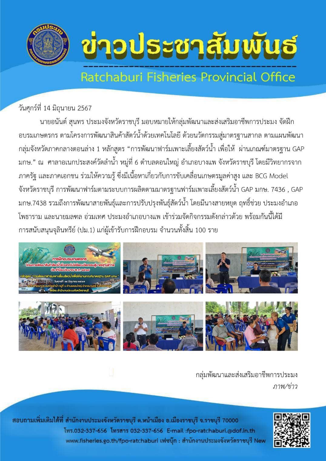 วันศุกร์ที่ 14 มิถุนายน 2567 นายอนันต์ สุนทร ประมงจังหวัดราชบุรี มอบหมายให้ กลุ่มพัฒนาและส่งเสริมอาชีพการประมง จัดฝึกอบรมเกษตรกร ตามโครงการพัฒนาสินค้าสัตว์น้ำด้วยเทคโนโลยี ด้วยนวัตกรรมสู่มาตรฐานสากล ตามแผนพัฒนากลุ่มจังหวัดภาคกลางตอนล่าง 1 หลักสูตร “การพัฒนาฟาร์มเพาะเลี้ยงสัตว์น้ำ เพื่อให้ ผ่านเกณฑ์มาตรฐาน GAP มกษ.” ณ ศาลาอเนกประสงค์วัดลำน้ำ หมู่ที่ 6 ตำบลดอนใหญ่ อำเภอบางแพ จังหวัดราชบุรี โดยมีวิทยากรจากภาครัฐ เเละภาคเอกชน ร่วมให้ความรู้ ซึ่งมีเนื้อหาเกี่ยวกับการขับเคลื่อนเกษตรมูลค่าสูง และ BCG Model จังหวัดราชบุรี การพัฒนาฟาร์มตามระบบการผลิตตามมาตรฐานฟาร์มเพาะเลี้ยงสัตว์น้ำ GAP มกษ. 7436 , GAP มกษ.7438 รวมถึงการพัฒนาสายพันธุ์เเละการปรับปรุงพันธุ์สัตว์น้ำ โดยมีนางสายหยุด ฤทธิ์ช่วย ประมงอำเภอโพธาราม และนายมลฑล อ่วมเทศ ประมงอำเภอบางแพ เข้าร่วมจัดกิจกรรมดังกล่าวด้วย พร้อมกันนี้ได้มีการสนับสนุนจุลินทรีย์ (ปม.1) เเก่ผู้เข้ารับการฝึกอบรม จำนวนทั้งสิ้น 100 ราย