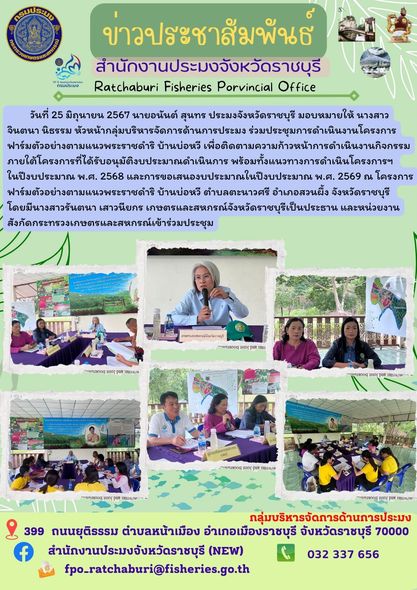 วันที่ 25 มิถุนายน 2567 นายอนันต์ สุนทร ประมงจังหวัดราชบุรี มอบหมายให้ นางสาวจินตนา นิธรรม หัวหน้ากลุ่มบริหารจัดการด้านการประมง ร่วมประชุมการดำเนินงานโครงการฟาร์มตัวอย่างตามแนวพระราชดำริ บ้านบ่อหวี เพื่อติดตามความก้าวหน้าการดำเนินงานกิจกรรมภายใต้โครงการที่ได้รับอนุมัติงบประมาณดำเนินการ พร้อมทั้งแนวทางการดำเนินโครงการฯ ในปีงบประมาณ พ.ศ. 2568 และการขอเสนองบประมาณในปีงบประมาณ พ.ศ. 2569 ณ โครงการฟาร์มตัวอย่างตามแนวพระราชดำริ บ้านบ่อหวี ตำบลตะนาวศรี อำเภอสวนผึ้ง จังหวัดราชบุรี โดยมีนางสาวรันตนา เสาวนียกร เกษตรและสหกรณ์จังหวัดราชบุรีเป็นประธาน และหน่วยงานสังกัดกระทรวงเกษตรและสหกรณ์เข้าร่วมประชุม