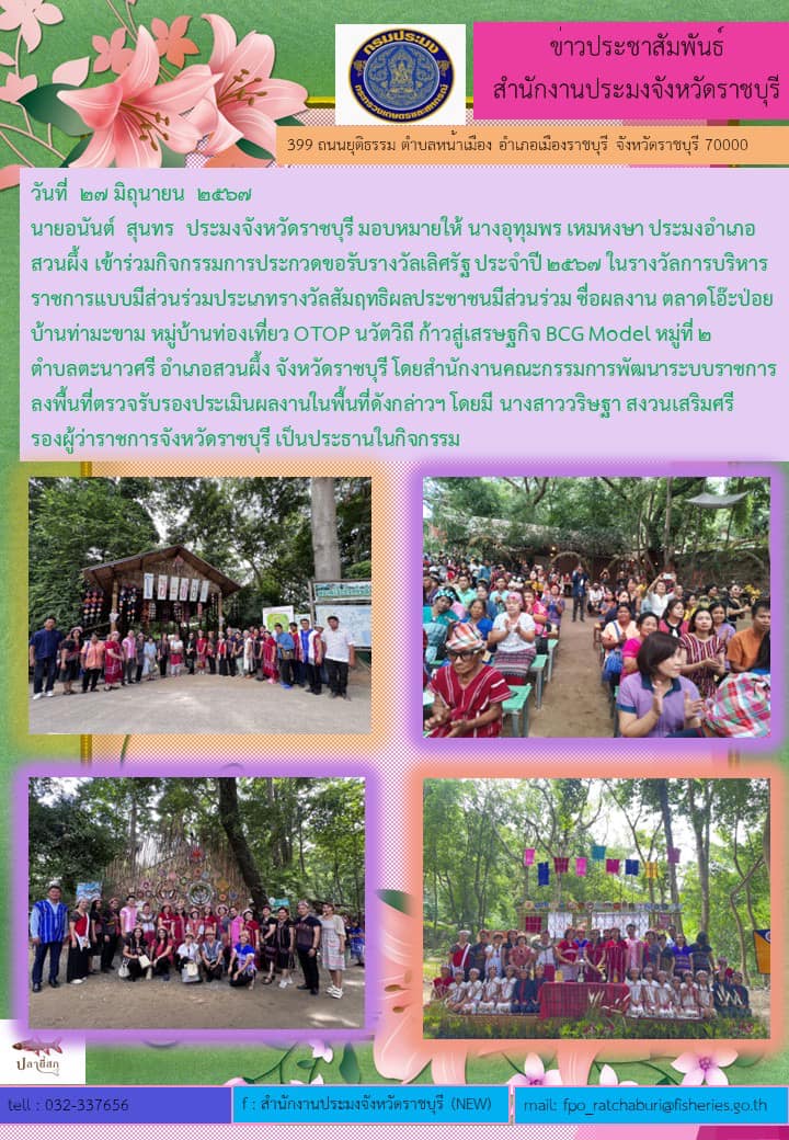 วันที่ 27 มิถุนายน 2567 นายอนันต์ สุนทร ประมงจังหวัดราชบุรี มอบหมายให้ นางอุทุมพร เหมหงษา ประมงอำเภอสวนผึ้ง เข้าร่วมกิจกรรมการประกวดขอรับรางวัลเลิศรัฐ ประจำปี 2567 ในรางวัลการบริหารราชการแบบมีส่วนร่วมประเภทรางวัลสัมฤทธิผลประชาชนมีส่วนร่วม ชื่อผลงาน ตลาดโอ๊ะป่อย บ้านท่ามะขาม หมู่บ้านท่องเที่ยว OTOP นวัตวิถี ก้าวสู่เสรษฐกิจ BCG Model หมู่ที่ 2 ตำบลตะนาวศรี อำเภอสวนผึ้ง จังหวัดราชบุรี โดยสำนักงานคณะกรรมการพัฒนาระบบราชการลงพื้นที่ตรวจรับรองประเมินผลงานในพื้นที่ดังกล่าวฯ โดยมี นางสาววริษฐา สงวนเสริมศรี รองผู้ว่าราชการจังหวัดราชบุรี เป็นประธานในกิจกรรม