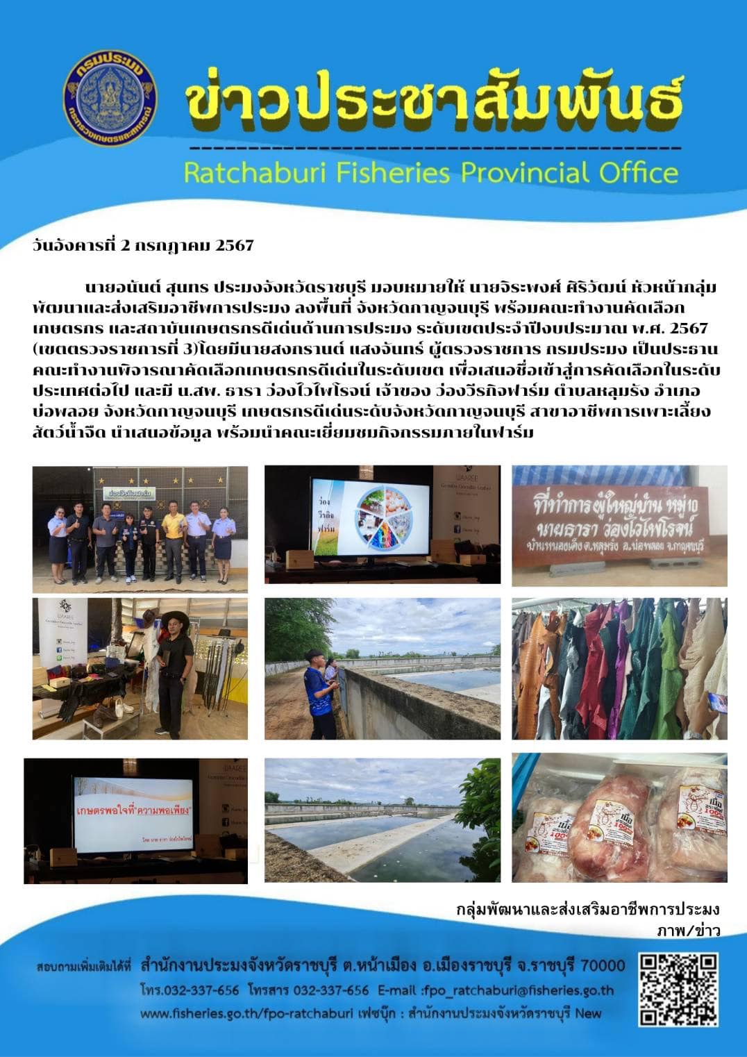 ลงพื้นที่จังหวัดกาญจนบุรี พร้อมคณะทำงานคัดเลือกเกษตรกร และสถาบันเกษตรกรดีเด่นด้านการประมง ระดับเขต (เขตตรวจราชการที่ 3) ประจำปีงบประมาณ พ.ศ. 2567..คลิก