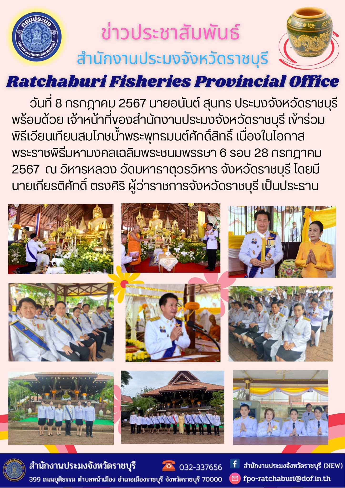 วันที่ 8 กรกฎาคม 2567 นายอนันต์ สุนทร ประมงจังหวัดราชบุรี พร้อมด้วย เจ้าหน้าที่ของสำนักงานประมงจังหวัดราชบุรี เข้าร่วมพิธีเวียนเทียนสมโภชน้ำพระพุุทธมนต์ศักดิ์สิทธิ์ เนื่องในโอกาสพระราชพิธีมหามงคลเฉลิมพระชนมพรรษา 6 รอบ 28 กรกฎาคม 2567 ณ วิหารหลวง วัดมหาธาตุวรวิหาร จังหวัดราชบุรี โดยมีนายเกียรติศักดิ์ ตรงศิริ ผู้ว่าราชการจังหวัดราชบุรีเป็นประธาน
