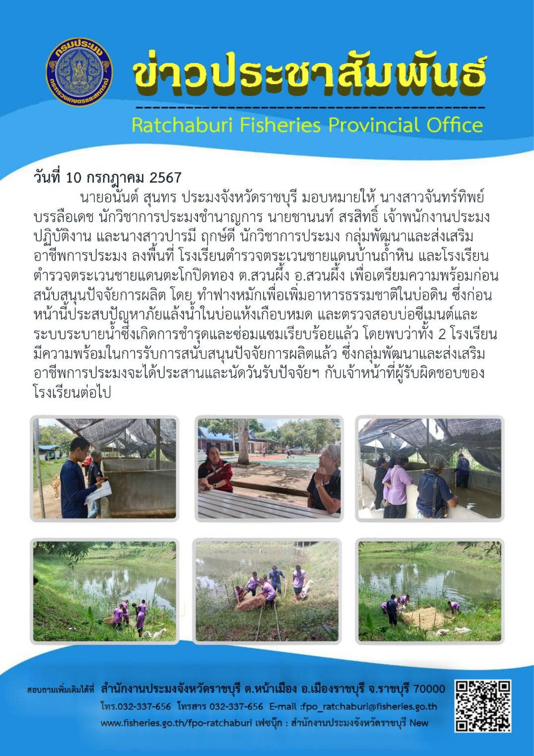 วันที่ 10 กรกฎาคม 2567 นายอนันต์ สุนทร ประมงจังหวัดราชบุรี มอบหมายให้ นางสาวจันทร์ทิพย์ บรรลือเดช นักวิชาการประมงชำนาญการ นายชานนท์ สรสิทธิ์ เจ้าพนักงานประมงปฏิบัติงาน และนางสาวปารมี ฤกษ์ดี นักวิชาการประมง กลุ่มพัฒนาและส่งเสริมอาชีพการประมง ลงพื้นที่ โรงเรียนตำรวจตระเวนชายแดนบ้านถ้ำหิน และโรงเรียนตำรวจตระเวนชายแดนตะโกปิดทอง ต.สวนผึ้ง อ.สวนผึ้ง เพื่อเตรียมความพร้อมก่อนสนับสนุนปัจจัยการผลิต โดย ทำฟางหมักเพื่อเพิ่มอาหารธรรมชาติในบ่อดิน ซึ่งก่อนหน้านี้ประสบปัญหาภัยแล้งน้ำในบ่อแห้งเกือบหมด และตรวจสอบบ่อซีเมนต์และระบบระบายน้ำซึ่งเกิดการชำรุดและซ่อมแซมเรียบร้อยแล้ว โดยพบว่าทั้ง 2 โรงเรียนมีความพร้อมในการรับการสนับสนุนปัจจัยการผลิตแล้ว ซึ่งกลุ่มพัฒนาและส่งเสริมอาชีพการประมงจะได้ประสานและนัดวันรับปัจจัยฯ กับเจ้าหน้าที่ผู้รับผิดชอบของโรงเรียนต่อไป