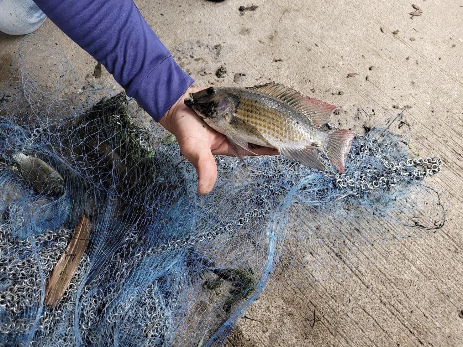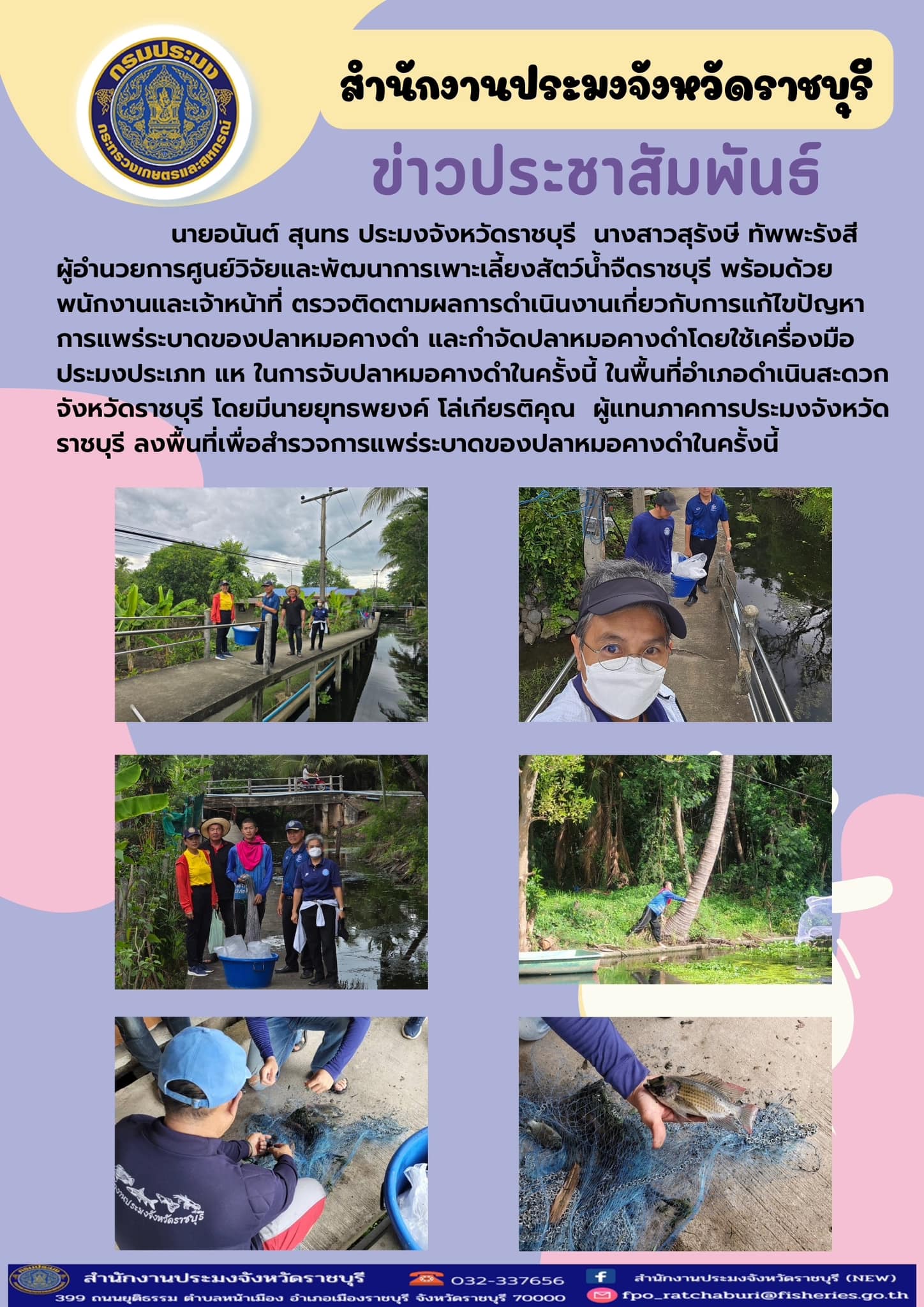 วันที่ 12 กรกฎาคม 2567 นายอนันต์ สุนทร ประมงจังหวัดราชบุรี นางสาวสุรังษี ทัพพะรังสี ผู้อำนวยการศูนย์วิจัยและพัฒนาการเพาะเลี้ยงสัตว์น้ำจืดราชบุรี พร้อมด้วยพนักงานและเจ้าหน้าที่ ตรวจติดตามผลการดำเนินงานเกี่ยวกับการแก้ไขปัญหาการแพร่ระบาดของปลาหมอคางดำ และกำจัดปลาหมอคางดำโดยใช้เครื่องมือประมงประเภท แห ในการจับปลาหมอคางดำในครั้งนี้ ในพื้นที่อำเภอดำเนินสะดวก จังหวัดราชบุรี โดยมี นายยุทธพยงค์ โล่เกียรติคุณ ผู้แทนภาคการประมงจังหวัดราชบุรี ลงพื้นที่เพื่อสำรวจการแพร่ระบาดของปลาหมอคางดำในครั้งนี้