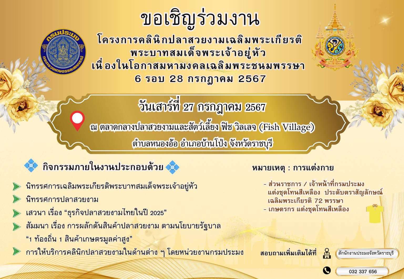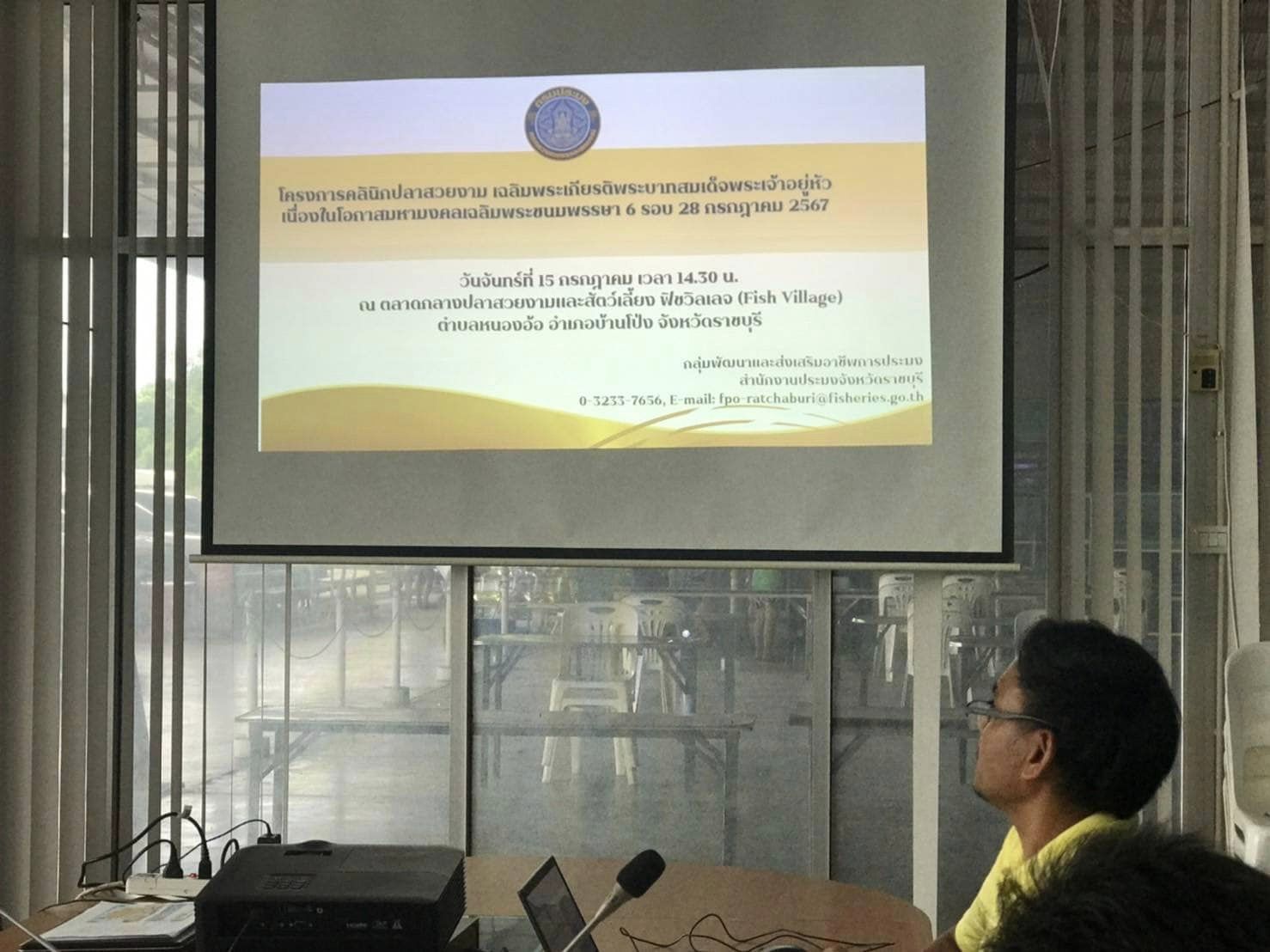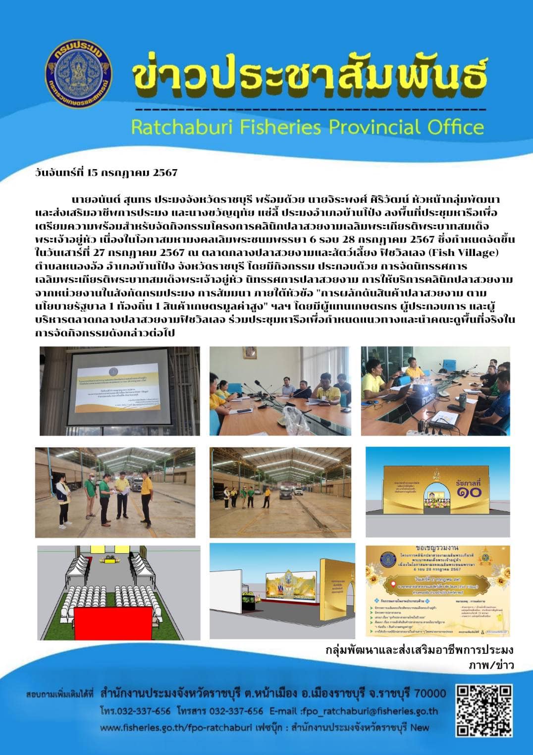 วันจันทร์ที่ 15 กรกฎาคม 2567 นายอนันต์ สุนทร ประมงจังหวัดราชบุรี พร้อมด้วย นายจิระพงศ์ ศิริวัฒน์ หัวหน้ากลุ่มพัฒนาและส่งเสริมอาชีพการประมง และนางขวัญฤทัย แซ่ลี้ ประมงอำเภอบ้านโป่ง ลงพื้นที่ประชุมหารือเพื่อเตรียมความพร้อมสำหรับจัดกิจกรรมโครงการคลินิกปลาสวยงามเฉลิมพระเกียรติพระบาทสมเด็จพระเจ้าอยู่หัว เนื่องในโอกาสมหามงคลเลิมพระชนมพรรษา 6 รอบ 28 กรกฎาคม 2567 ซึ่งกำหนดจัดขึ้นในวันเสาร์ที่ 27 กรกฎาคม 2567 ณ ตลาดกลางปลาสวยงามและสัตว์เลี้ยง ฟิชวิลเลจ (Fish Village) ตำบลหนองอ้อ อำเภอบ้านโป่ง จังหวัดราชบุรี โดยมีกิจกรรม ประกอบด้วย การจัดนิทรรศการเฉลิมพระเกียรติพระบาทสมเด็จพระเจ้าอยู่หัว นิทรรศการปลาสวยงาม การให้บริการคลินิกปลาสวยงาม จากหน่วยงานในสังกัดกรมประมง การสัมมนา ภายใต้หัวข้อ "การผลักดันสินค้าปลาสวยงาม ตามนโยบายรัฐบาล 1 ท้องถิ่น 1 สินค้าเกษตรมูลค่าสูง" ฯลฯ โดยมีผู้แทนเกษตรกร ผู้ประกอบการ และผู้บริหารตลาดกลางปลาสวยงามฟิชวิลเลจ ร่วมประชุมหารือเพื่อกำหนดแนวทางและนำคณะดูพื้นที่จริงในการจัดกิจกรรมดังกล่าวต่อไป