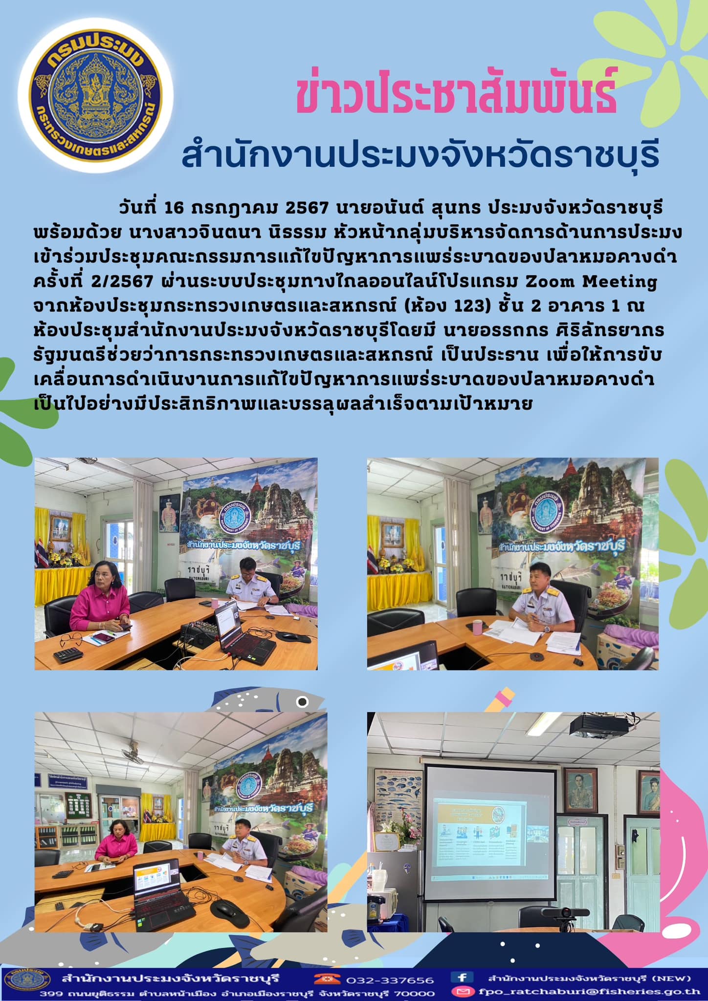 วันที่ 16 กรกฎาคม 2567 นายอนันต์ สุนทร ประมงจังหวัดราชบุรี พร้อมด้วย นางสาวจินตนา นิธรรม หัวหน้ากลุ่มบริหารจัดการด้านการประมง เข้าร่วมประชุมคณะกรรมการแก้ไขปัญหาการแพร่ระบาดของปลาหมอคางดำ ครั้งที่ 2/2567 ผ่านระบบประชุมทางไกลออนไลน์โปรแกรม Zoom Meeting จากห้องประชุมกระทรวงเกษตรและสหกรณ์ (ห้อง 123) ชั้น 2 อาคาร 1 ณ ห้องประชุมสำนักงานประมงจังหวัดราชบุรีโดยมี นายอรรถกร ศิริลัทธยากร รัฐมนตรีช่วยว่าการกระทรวงเกษตรและสหกรณ์ เป็นประธาน เพื่อให้การขับเคลื่อนการดำเนินงานการแก้ไขปัญหาการแพร่ระบาดของปลาหมอคางดำเป็นไปอย่างมีประสิทธิภาพและบรรลุผลสำเร็จตามเป้าหมาย