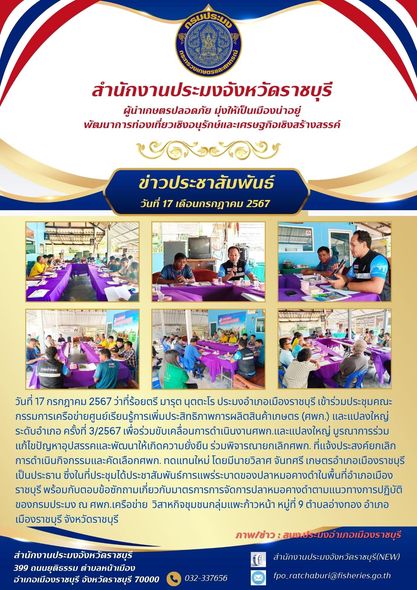 วันที่ 17 กรกฎาคม 2567 ว่าที่ร้อยตรี มารุต นุตตะโร ประมงอำเภอเมืองราชบุรี เข้าร่วมประชุมคณะกรรมการเครือข่ายศูนย์เรียนรู้การเพิ่มประสิทธิภาพการผลิตสินค้า เกษตร (ศพก.) และแปลงใหญ่ ระดับอำเภอ ครั้งที่ 3/2567 เพื่อร่วมขับเคลื่อนการ ดำเนินงานศพก. และแปลงใหญ่ บูรณาการร่วมแก้ไขปัญหาอุปสรรค และพัฒนาให้เกิด ความยั่งยืน พิจารณายกเลิกศพก. ที่แจ้งประสงค์ยกเลิกการดำเนินกิจกรรม และคัดเลือก ศพก. ทดแทนใหม่ โดยมีนายวิลาศ จันทศรี เกษตรอำเภอเมืองราชบุรี เป็นประธาน ซึ่งในที่ประชุมได้ประชาสัมพันธ์การแพร่ระบาดของปลาหมอคางดำในพื้นที่อำเภอเมืองราชบุรี พร้อมกับตอบข้อซักถาม เกี่ยวกับมาตรการการจัดการปลาหมอคางดำตามแนวทาง การปฏิบัติของกรมประมง ณ ศพก.เครือข่าย วิสาหกิจชุมชนกลุ่มแพะก้าวหน้า หมู่ที่ 9 ตำบลอ่างทอง อำเภอเมืองราชบุรี จังหวัดราชบุรี