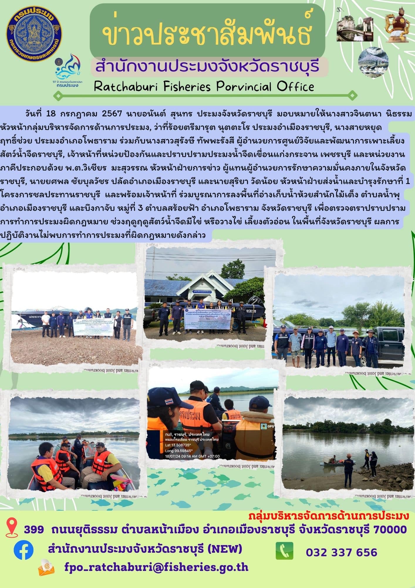 วันที่ 18 กรกฎาคม 2567 นายอนันต์ สุนทร ประมงจังหวัดราชบุรี มอบหมายให้นางสาวจินตนา นิธรรม หัวหน้ากลุ่มบริหารจัดการด้านการประมง, ว่าที่ร้อยตรีมารุต นุตตะโร ประมงอำเมืองราชบุรี, นางสายหยุด ฤทธิ์ช่วย ประมงอำเภอโพธาราม ร่วมกับนางสาวสุรังษี ทัพพะรังสี ผู้อำนวยการศูนย์วิจัยและพัฒนาการเพาะเลี้ยงสัตว์น้ำจืดราชบุรี, เจ้าหน้าที่หน่วยป้องกันและปราบปรามประมงน้ำจืดเขื่อนแก่งกระจาน เพชรบุรี และหน่วยงานภาคีประกอบด้วย พ.ต.วิเชียร มะสุวรรณ หัวหน้าฝ่ายการข่าว ผู้แทนผู้อำนวยการรักษาความมั่นคงภายในจังหวัดราชบุรี, นายยศพล ชัยบุลวัชร ปลัดอำเภอเมืองราชบุรี และนายสุริยา วัดน้อย หัวหน้าฝ่ายส่งน้ำและบำรุงรักษาที่ 1 โครงการชลประทานราชบุรี และพร้อมเจ้าหน้าที่ ร่วมบูรณาการลงพื้นที่อ่างเก็บน้ำห้วยสำนักไม้เต็ง ตำบลน้ำพุ อำเภอเมืองราชบุรี และบึงกาจับ หมู่ที่ 3 ตำบลชำแระ อำเภอโพธาราม จังหวัดราชบุรี เพื่อตรวจตราปราบปรามการทำการประมงผิดกฎหมาย ช่วงฤดูฤดูสัตว์น้ำจืดมีไข่ หรือวางไข่ เลี้ยงตัวอ่อน ในพื้นที่จังหวัดราชบุรี ผลการปฏิบัติงานไม่พบการทำการประมงที่ผิดกฎหมายดังกล่าว