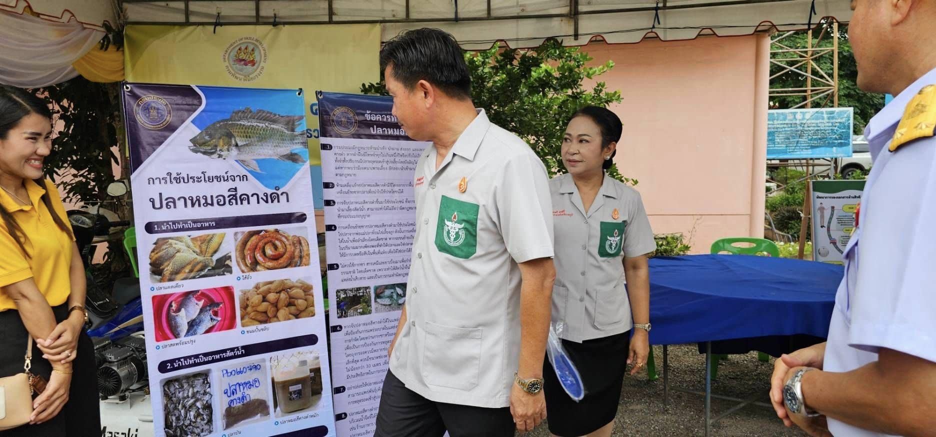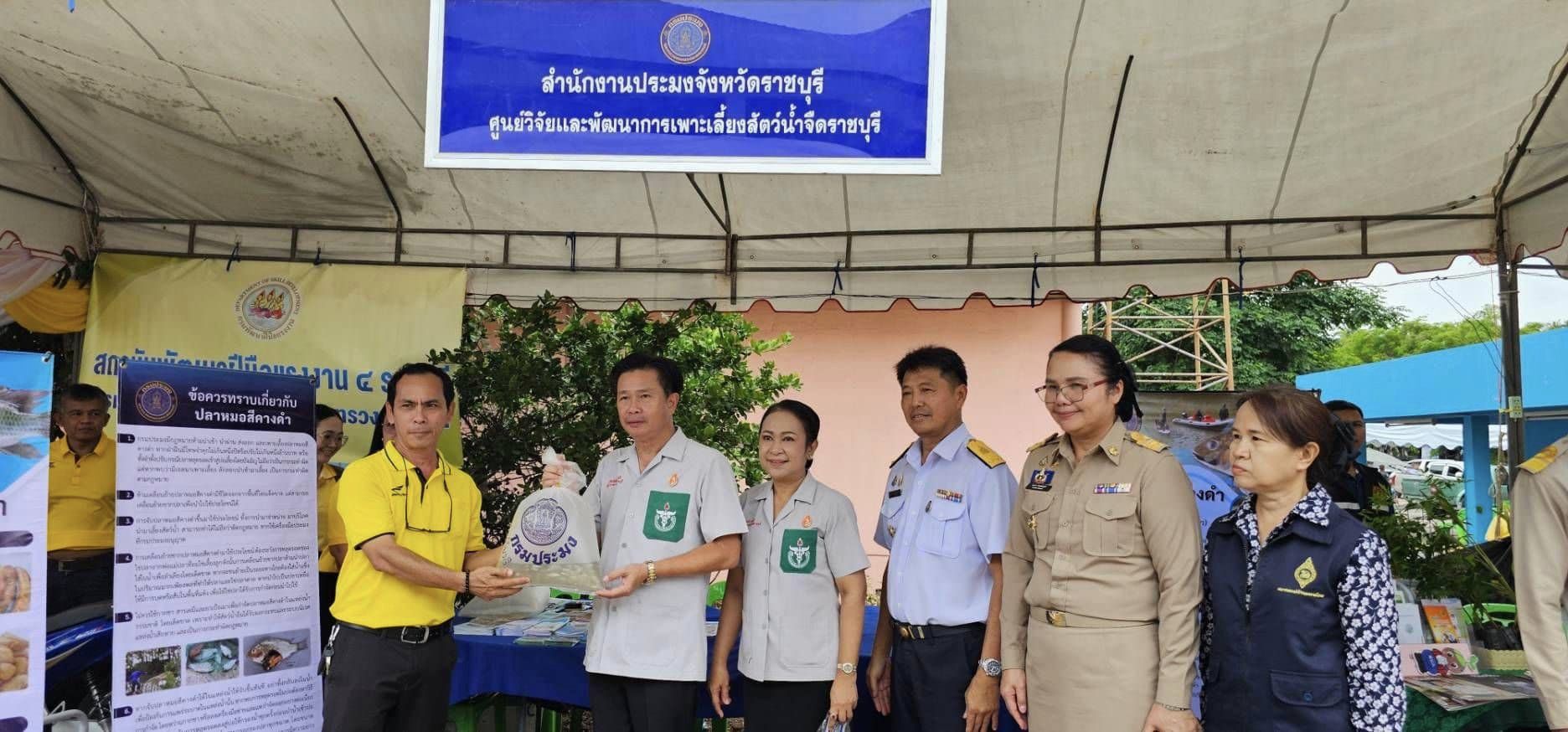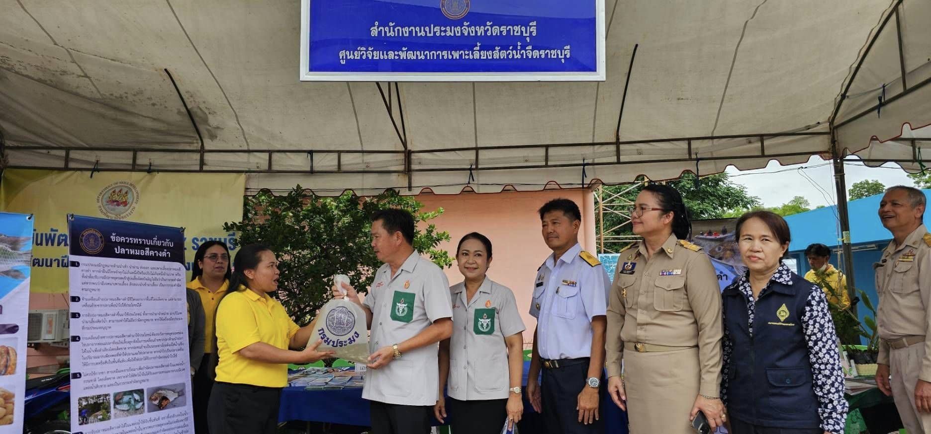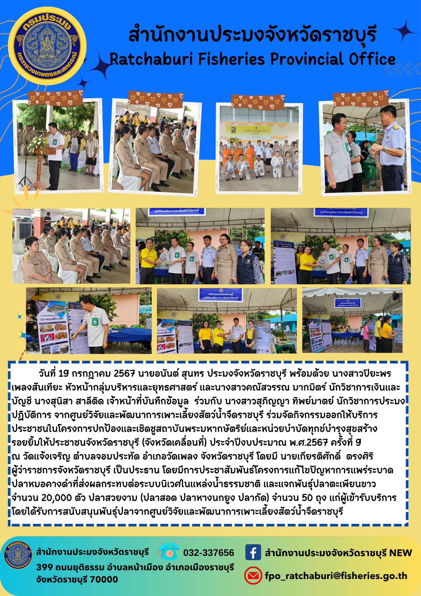 วันที่ 19 กรกฎาคม 2567 นายอนันต์ สุนทร ประมงจังหวัดราชบุรี พร้อมด้วย นางสาวปิยะพร เพลงสันเทียะ หัวหน้ากลุ่มบริหารและยุทธศาสตร์ และนางสาวคณัสวรรณ มากมิตร์ นักวิชาการเงินและบัญชี นางสุนิสา สาลีติด เจ้าหน้าที่บันทึกข้อมูล ร่วมกับ นางสาวสุภิญญา ทิพย์มาตย์ นักวิชาการประมงปฏิบัติการ จากศูนย์วิจัยและพัฒนาการเพาะเลี้ยงสัตว์น้ำจืดราชบุรี ร่วมจัดกิจกรรมออกให้บริการประชาชนในโครงการปกป้องและเชิดชูสถาบันพระมหากษัตริย์และหน่วยบำบัดทุกข์บำรุงสุขสร้างรอยยิ้มให้ประชาชนจังหวัดราชบุรี (จังหวัดเคลื่อนที่) ประจำปีงบประมาณ พ.ศ.2567 ครั้งที่ 9 ณ วัดแจ้งเจริญ ตำบลจอมประทัด อำเภอวัดเพลง จังหวัดราชบุรี โดยมี นายเกียรติศักดิ์ ตรงศิริ ผู้ว่าราชการจังหวัดราชบุรี เป็นประธาน โดยมีการประชาสัมพันธ์โครงการแก้ไขปัญหาการแพร่ระบาดปลาหมอคางดำที่ส่งผลกระทบต่อระบบนิเวศในแหล่งน้ำธรรมชาติ และแจกพันธุ์ปลาตะเพียนขาว จำนวน 20,000 ตัว ปลาสวยงาม (ปลาสอด ปลาหางนกยูง ปลากัด) จำนวน 50 ถุง แก่ผู้เข้ารับบริการ โดยได้รับการสนับสนุนพันธุ์ปลาจากศูนย์วิจัยและพัฒนาการเพาะเลี้ยงสัตว์น้ำจืดราชบุรี