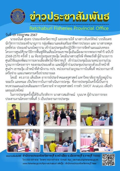 วันศุกร์ที่ 19 กรกฎาคม 2567 นายอนันต์ สุนทร ประมงจังหวัดราชบุรี มอบหมายให้ นางสาวจันทร์ทิพย์ บรรลือเดช นักวิชาการประมงชำนาญการ กลุ่มพัฒนาและส่งเสริมอาชีพการประมง และ นางสายหยุด ฤทธิ์ช่วย ประมงอำเภอโพธาราม เข้าร่วมประชุมเชิงปฏิบัติการการจัดทำแผนแม่บทของโครงการศูนย์ศึกษาวิธีการฟื้นฟูที่ดินเสื่อมโทรมเขาชะงุ้มอันเนื่องมาจากพระราชดำริ ฉบับปี 2568-2570 ครั้งที่ 1 ณ ห้องประชุมเขาชะงุ้ม โดยมีนางสาวสุรังษี ทัพพะรังสี ผู้อำนวยการศูนย์วิจัยและพัฒนาการเพาะเลี้ยงสัตว์น้ำจืดราชบุรี เข้าร่วมประชุมในนามหน่วยงานร่วมบูรณาการโครงการฯ ของกรมประมงด้วย และมีผู้เข้าร่วมประชุมประกอบด้วยเจ้าหน้าที่ศูนย์ฯ เขาชะงุ้ม เจ้าหน้าที่สำนักงาน กปร. หน่วยงานร่วมบูรณาการในพื้นที่ หน่วยงานภาคีเครือข่าย และเกษตรกรเครือข่ายขยายผล โดยมี ดร.ถาวร เส้งเอียด อาจารย์ประจำคณะคุรุศาสตร์ มหาวิทยาลัยราชภัฏหมู่บ้านจอมบึง และคณะ เป็นวิทยากรในการดำเนินการปะชุม ซึ่งการประชุมในครั้งนี้เป็นการทบทวนแผนแม่บทเดิมและการวิเคราะห์ ทางยุทธศาสตร์ การทำ SWOT Analysis เพื่อทำแผนแม่บทใหม่ ในการประชุมครั้งนี้ได้รับเกียรติจาก นางสาวสมลักษณ์ บุนนาค ผู้อำนวยการกองประสานงานโครงการพื้นที่ 5 เป็นประธานการประชุม
