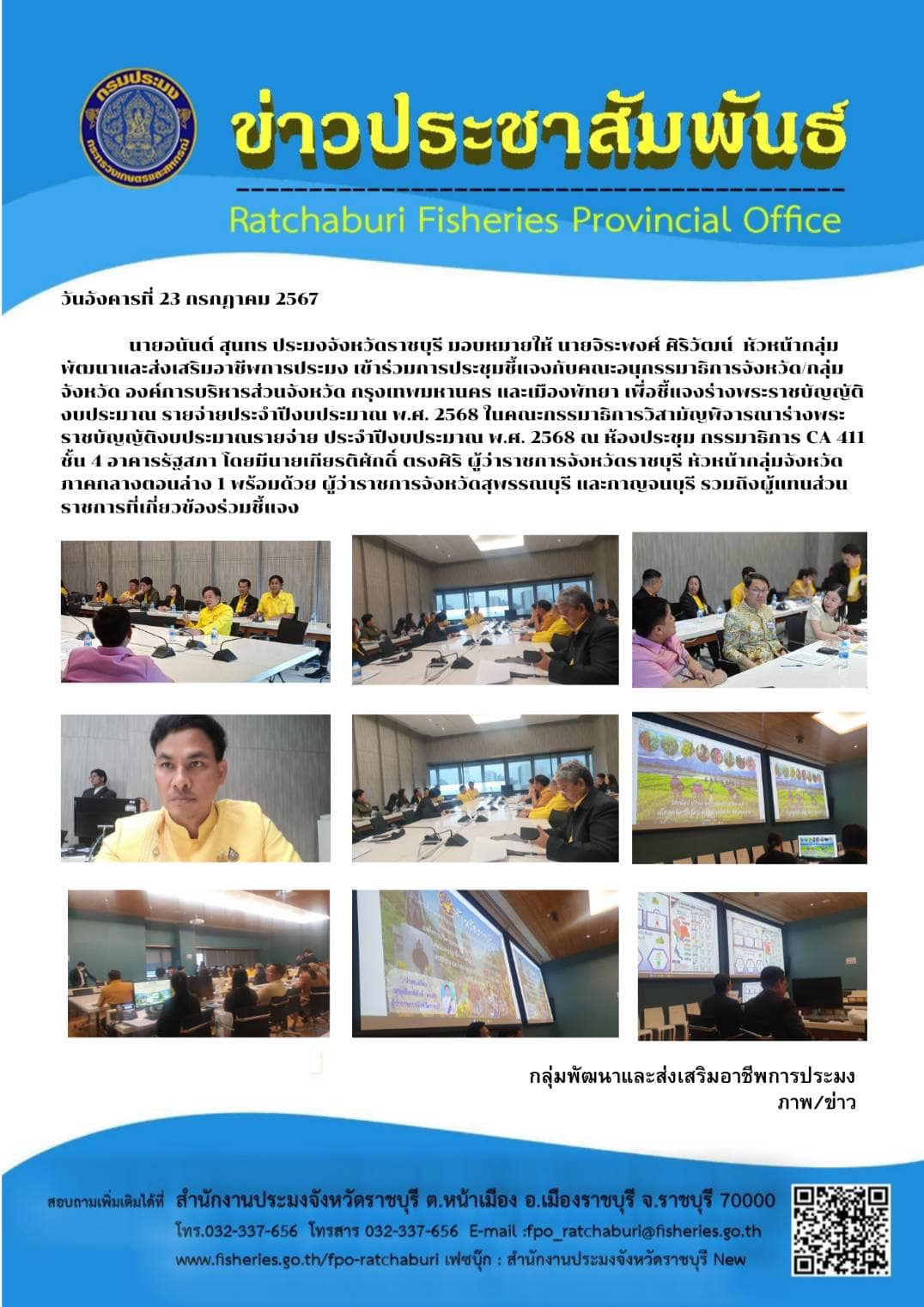 วันอังคารที่ 23 กรกฎาคม 2567 นายอนันต์ สุนทร ประมงจังหวัดราชบุรี มอบหมายให้ นายจิระพงศ์ ศิริวัฒน์ หัวหน้ากลุ่มพัฒนาและส่งเสริมอาชีพการประมง เข้าร่วมการประชุมชี้แจงกับคณะอนุกรรมาธิการจังหวัด/กลุ่มจังหวัด องค์การบริหารส่วนจังหวัด กรุงเทพมหานคร และเมืองพัทยา เพื่อชี้แจงร่างพระราชบัญญัติงบประมาณ รายจ่ายประจำปีงบประมาณ พ.ศ. 2568 ในคณะกรรมาธิการวิสามัญพิจารณาร่างพระราชบัญญัติงบประมาณรายจ่าย ประจำปีงบประมาณ พ.ศ. 2568 ณ ห้องประชุม กรรมาธิการ CA 411 ชั้น 4 อาคารรัฐสภา โดยมีนายเกียรติศักดิ์ ตรงศิริ ผู้ว่าราชการจังหวัดราชบุรี หัวหน้ากลุ่มจังหวัดภาคกลางตอนล่าง 1 พร้อมด้วย ผู้ว่าราชการจังหวัดสุพรรณบุรี และกาญจนบุรี รวมถึงผู้แทนส่วนราชการที่เกี่ยวข้องร่วมชี้แจง
