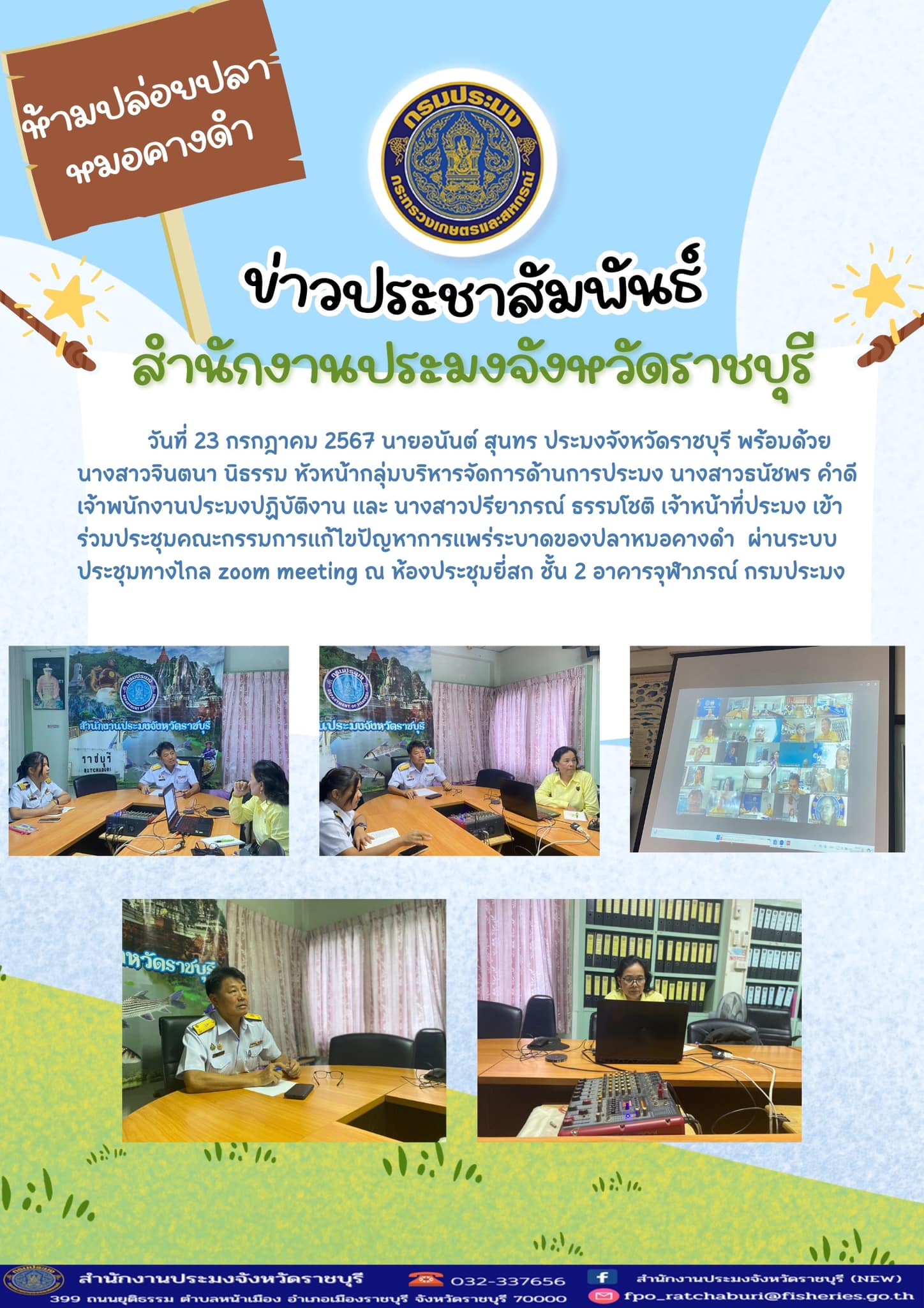 วันที่ 23 กรกฎาคม 2567 นายอนันต์ สุนทร ประมงจังหวัดราชบุรี พร้อมด้วย นางสาวจินตนา นิธรรม หัวหน้ากลุ่มบริหารจัดการด้านการประมง นางสาวธนัชพร คำดี เจ้าพนักงานประมงปฏิบัติงาน และ นางสาวปรียาภรณ์ ธรรมโชติ เจ้าหน้าที่ประมง เข้าร่วมประชุมคณะกรรมการแก้ไขปัญหาการแพร่ระบาดของปลาหมอคางดำ ผ่านระบบประชุมทางไกล zoom meeting ณ ห้องประชุมยี่สก ชั้น 2 อาคารจุฬาภรณ์ กรมประมง
