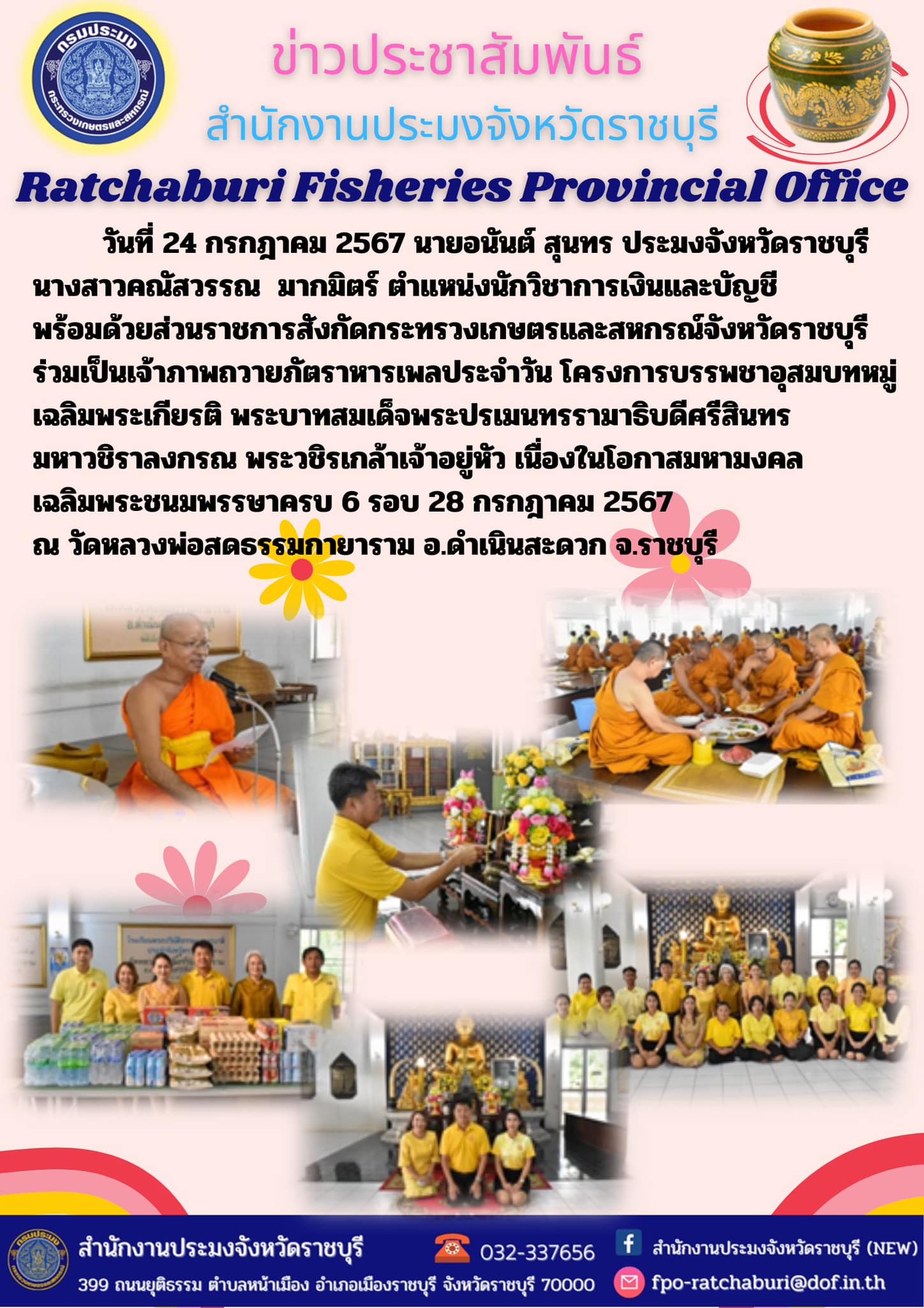 วันที่ 24 กรกฎาคม 2567 นายอนันต์ สุนทร ประมงจังหวัดราชบุรี และ นางสาวคณัสวรรณ มากมิตร์ นักวิชาการเงินและบัญชี พร้อมด้วย ส่วนราชการสังกัดกระทรวงเกษตรและสหกรณ์จังหวัดราชบุรี ร่วมเป็นเจ้าภาพถวายภัตราหารเพลประจำวัน โครงการบรรพชาอุสมบทหมู่ เฉลิมพระเกียรติ พระบาทสมเด็จพระปรเมนทรรามาธิบดีศรีสินทร มหาวชิราลงกรณ พระวชิรเกล้าเจ้าอยู่หัว เนื่องในโอกาสมหามงคลเฉลิมพระชนมพรรษาครบ 6 รอบ 28 กรกฎาคม 2567 ณ วัดหลวงพ่อสดธรรมกายาราม อำเภอดำเนินสะดวก จังหวัดราชบุรี