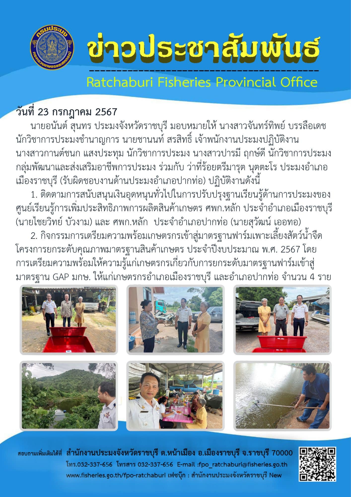วันอังคารที่ 23 กรกฎาคม 2567 นายอนันต์ สุนทร ประมงจังหวัดราชบุรี มอบหมายให้ นางสาวจันทร์ทิพย์ บรรลือเดช นักวิชาการประมงชำนาญการ นายชานนท์ สรสิทธิ์ เจ้าพนักงานประมงปฏิบัติงาน นางสาวกานต์ชนก แสงประทุม นักวิชาการประมง นางสาวปารมี ฤกษ์ดี นักวิชาการประมง กลุ่มพัฒนาและส่งเสริมอาชีพการประมง ร่วมกับ ว่าที่ร้อยตรีมารุต นุตตะโร ประมงอำเภอเมืองราชบุรี (รับผิดชอบงานด้านประมงอำเภอปากท่อ) ปฏิบัติงานดังนี้