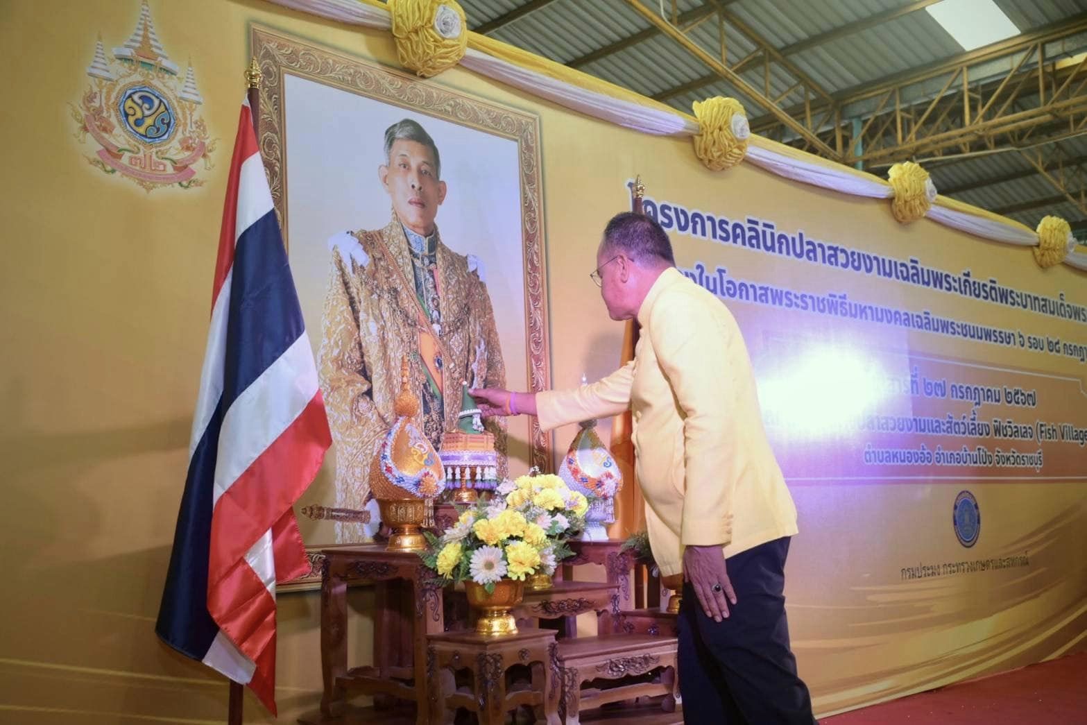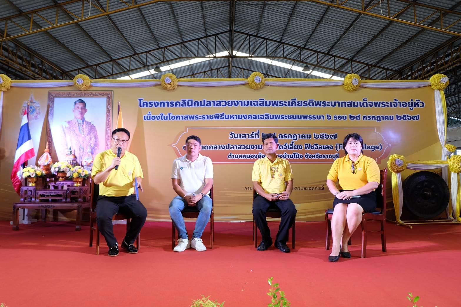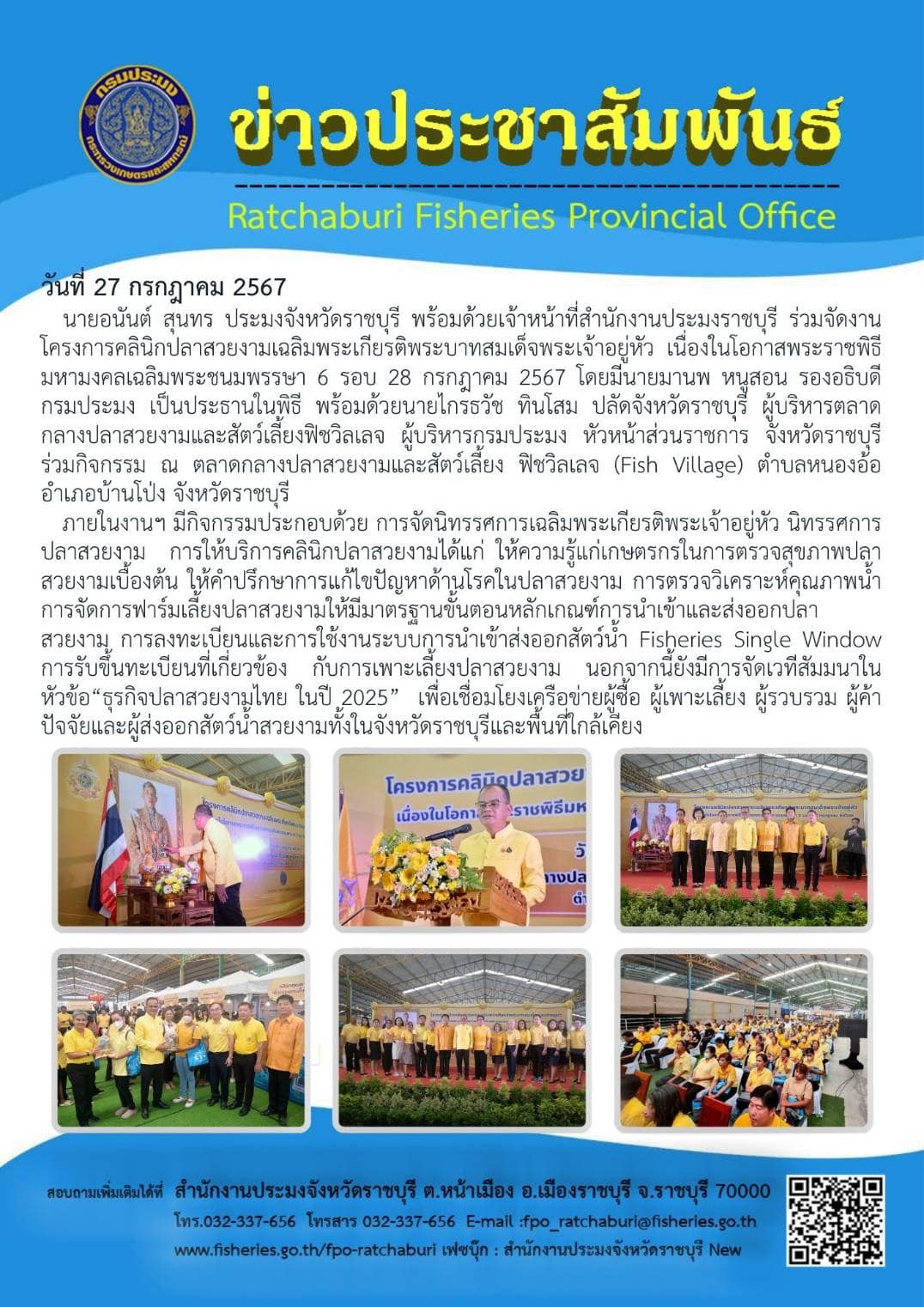 วันเสาร์ที่ 27 กรกฎาคม 2567 นายอนันต์ สุนทร ประมงจังหวัดราชบุรี พร้อมด้วยเจ้าหน้าที่สำนักงานประมงราชบุรี ร่วมจัดงานโครงการคลินิกปลาสวยงามเฉลิมพระเกียรติพระบาทสมเด็จพระเจ้าอยู่หัว เนื่องในโอกาสพระราชพิธีมหามงคลเฉลิมพระชนมพรรษา 6 รอบ 28 กรกฎาคม 2567 โดยมีนายมานพ หนูสอน รองอธิบดีกรมประมง เป็นประธานในพิธี พร้อมด้วยนายไกรธวัช ทินโสม ปลัดจังหวัดราชบุรี ผู้บริหารตลาดกลางปลาสวยงามและสัตว์เลี้ยงฟิชวิลเลจ ผู้บริหารกรมประมง หัวหน้าส่วนราชการ จังหวัดราชบุรีร่วมกิจกรรม ณ ตลาดกลางปลาสวยงามและสัตว์เลี้ยง ฟิชวิลเลจ (Fish Village) ตำบลหนองอ้อ อำเภอบ้านโป่ง จังหวัดราชบุรี