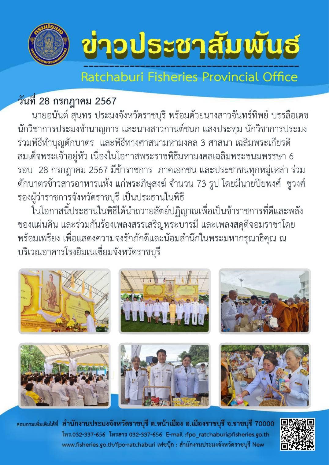 วันอาทิตย์ที่ 28 กรกฎาคม 2567 นายอนันต์ สุนทร ประมงจังหวัดราชบุรี พร้อมด้วยนางสาวจันทร์ทิพย์ บรรลือเดช นักวิชาการประมงชำนาญการ และนางสาวกานต์ชนก แสงประทุม นักวิชาการประมง ร่วมพิธีทำบุญตักบาตร และพิธีทางศาสนามหามงคล 3 ศาสนา เฉลิมพระเกียรติสมเด็จพระเจ้าอยู่หัว เนื่องในโอกาสพระราชพิธีมหามงคลเฉลิมพระชนมพรรษา 6 รอบ 28 กรกฎาคม 2567 มีข้าราชการ ภาคเอกชน และประชาชนทุกหมู่เหล่า ร่วมตักบาตรข้าวสารอาหารแห้ง แก่พระภิษุสงฆ์ จำนวน 73 รูป โดยมีนายปิยพงศ์ ชูวงศ์ รองผู้ว่าราชการจังหวัดราชบุรี เป็นประธานในพิธี