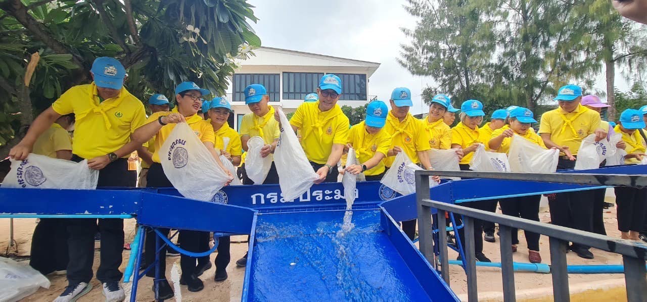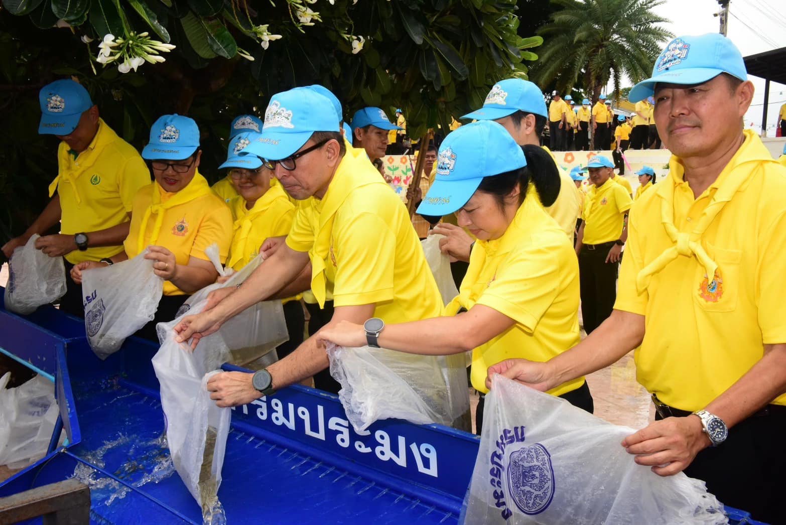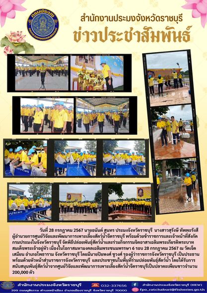 วันที่ 28 กรกฎาคม 2567 นายอนันต์ สุนทร ประมงจังหวัดราชบุรี นางสาวสุรังษี ทัพพะรังสี ผู้อำนวยการศูนย์วิจัยและพัฒนาการเพาะเลี้ยงสัตว์น้ำจืดราชบุรี พร้อมด้วย ข้าราชการและเจ้าหน้าที่สังกัดกรมประมงในจังหวัดราชบุรี จัดพิธีปล่อยพันธุ์สัตว์น้ำและร่วมกิจกรรมจิตอาสาเฉลิมพระเกียรติพระบาทสมเด็จพระเจ้าอยู่หัว เนื่องในโอกาสมหามงคลเฉลิมพระชนมพรรษา 6 รอบ 28 กรกฎาคม 2567 ณ วัดเจ็ดเสมียน อำเภอโพธาราม จังหวัดราชบุรี โดยมี นายปิยพงศ์ ชูวงศ์ รองผู้ว่าราชการจังหวัดราชบุรี เป็นประธาน พร้อมด้วยหัวหน้าส่วนราชการจังหวัดราชบุรี และประชาชนในพื้นที่ร่วมปล่อยพันธุ์สัตว์น้ำ โดยได้รับการสนับสนุนพันธุ์สัตว์น้ำจากศูนย์วิจัยและพัฒนาการเพาะเลี้ยงสัตว์น้ำจืดราชบุรี ปลาตะเพียนขาว จำนวน 200,000 ตัว