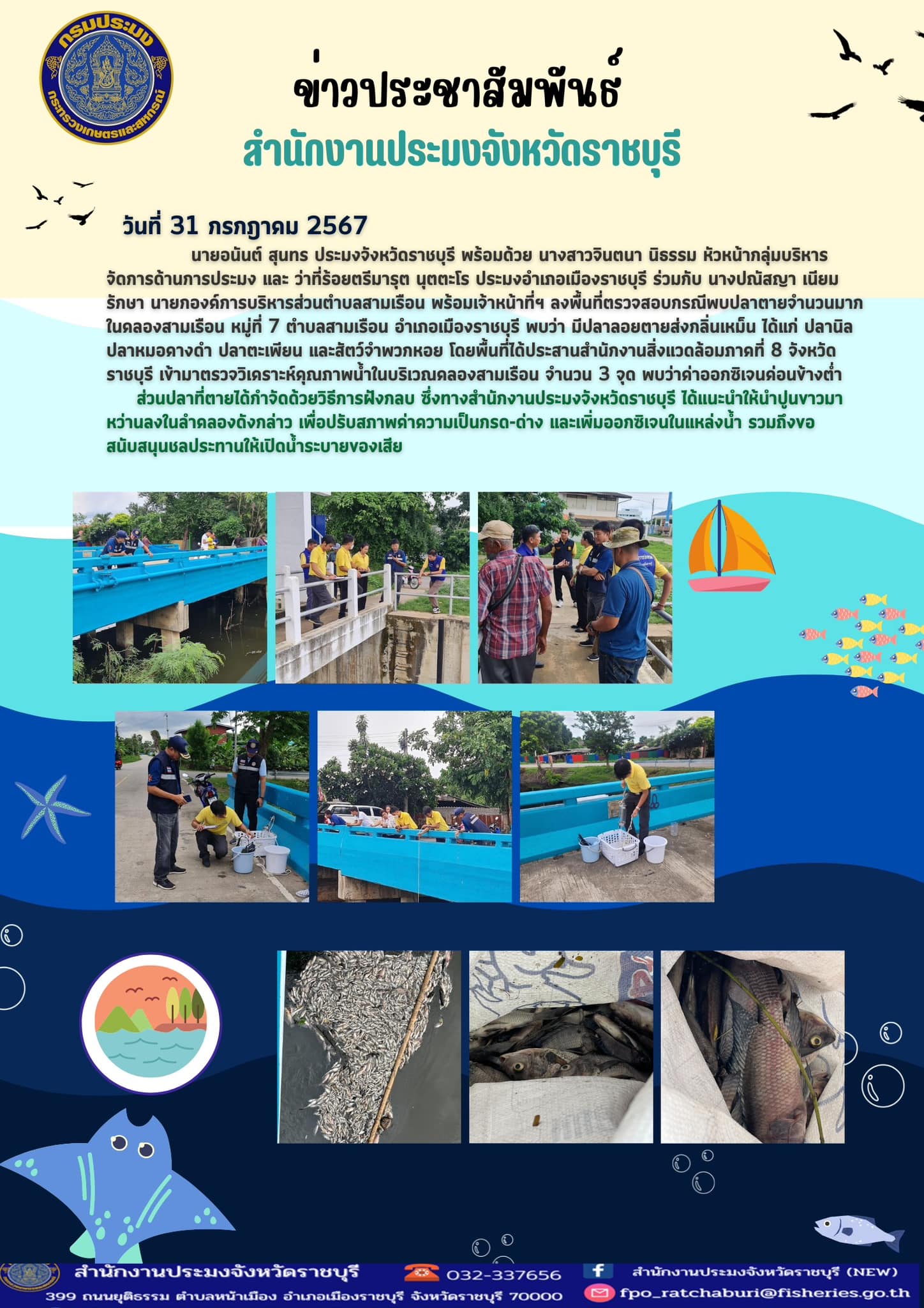 วันที่ 31 กรกฎาคม 2567 นายอนันต์ สุนทร ประมงจังหวัดราชบุรี พร้อมด้วย นางสาวจินตนา นิธรรม หัวหน้ากลุ่มบริหารจัดการด้านการประมง และ ว่าที่ร้อยตรีมารุต นุตตะโร ประมงอำเภอเมืองราชบุรี ร่วมกับ นางปณัสญา เนียมรักษา นายกองค์การบริหารส่วนตำบลสามเรือน พร้อมเจ้าหน้าที่ฯ ลงพื้นที่ตรวจสอบกรณีพบปลาตายจำนวนมากในคลองสามเรือน หมู่ที่ 7 ตำบลสามเรือน อำเภอเมืองราชบุรี พบว่า มีปลาลอยตายส่งกลิ่นเหม็น ได้แก่ ปลานิล ปลาหมอคางดำ ปลาตะเพียน และสัตว์จำพวกหอย โดยพื้นที่ได้ประสานสำนักงานสิ่งแวดล้อมภาคที่ 8 จังหวัดราชบุรี เข้ามาตรวจวิเคราะห์คุณภาพน้ำในบริเวณคลองสามเรือน จำนวน 3 จุด พบว่าค่าออกซิเจนค่อนข้างต่ำ ส่วนปลาที่ตายได้กำจัดด้วยวิธีการฝังกลบ ซึ่งทางสำนักงานประมงจังหวัดราชบุรี ได้แนะนำให้นำปูนขาวมาหว่านลงในลำคลองดังกล่าว เพื่อปรับสภาพค่าความเป็นกรด-ด่าง และเพิ่มออกซิเจนในแหล่งน้ำ รวมถึงขอสนับสนุนชลประทานให้เปิดน้ำระบายของเสีย