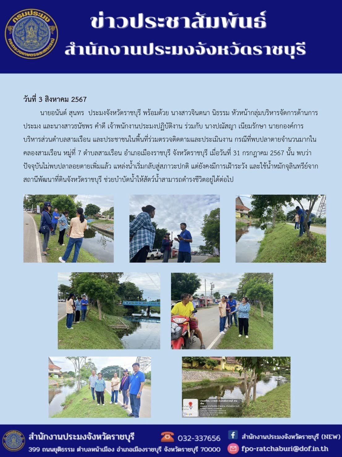วันที่ 3 สิงหาคม 2567 นายอนันต์ สุนทร ประมงจังหวัดราชบุรี พร้อมด้วย นางสาวจินตนา นิธรรม หัวหน้ากลุ่มบริหารจัดการด้านการประมง และนางสาวธนัชพร คำดี เจ้าพนักงานประมงปฏิบัติงาน ร่วมกับ นางปณัสญา เนียมรักษา นายกองค์การบริหารส่วนตำบลสามเรือน และประชาชนในพื้นที่ร่วมตรวจติดตามและประเมินงาน กรณีที่พบปลาตายจำนวนมากในคลองสามเรือน หมู่ที่ 7 ตำบลสามเรือน อำเภอเมืองราชบุรี จังหวัดราชบุรี เมื่อวันที่ 31 กรกฎาคม 2567 นั้น พบว่าปัจจุบันไม่พบปลาลอยตายเพิ่มแล้ว แหล่งน้ำเริ่มกลับสู่สภาวะปกติ แต่ยังคงมีการเฝ้าระวัง และใช้น้ำหมักจุลินทรีย์จากสถานีพัฒนาที่ดินจังหวัดราชบุรี ช่วยบำบัดน้ำให้สัตว์น้ำสามารถดำรงชีวิตอยู่ได้ต่อไป