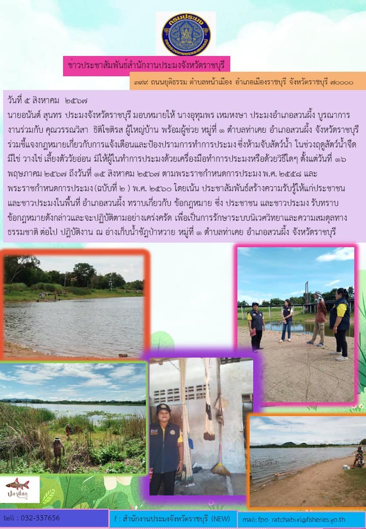 วันที่ 5 สิงหาคม 2567 นายอนันต์ สุนทร ประมงจังหวัดราชบุรี มอบหมายให้ นางอุทุมพร เหมหงษา ประมงอำเภอสวนผึ้ง บูรณาการงานร่วมกับ คุณวรรณวิสา ธิติโชติรส ผู้ใหญ่บ้าน พร้อมผู้ช่วย หมู่ที่ 1 ตำบลท่าเคย อำเภอสวนผึ้ง จังหวัดราชบุรี ร่วมชี้แจงกฎหมายเกี่ยวกับการแจ้งเตือนและป้องปรามการทำการประมง ซึ่งห้ามจับสัตว์น้ำ ในช่วงฤดูสัตว์น้ำจืดมีไข่ วางไข่ เลี้ยงตัววัยอ่อน มิให้ผู้ในทำการประมงด้วยเครื่องมือทำการประมงหรือด้วยวิธีใดๆ ตั้งแต่วันที่ 16 พฤษภาคม 2567 ถึงวันที่ 15 สิงหาคม 2567 ตามพระราชกำหนดการประมง พ.ศ. 2558 และ พระราชกำหนดการประมง (ฉบับที่ 2 ) พ.ศ. 2560 โดยเน้น ประชาสัมพันธ์สร้างความรับรู้ให้แก่ประชาชน และชาวประมงในพื้นที่ อำเภอสวนผึ้ง ทราบเกี่ยวกับ ข้อกฎหมาย ซึ่ง ประชาชน และชาวประมง รับทราบข้อกฎหมายดังกล่าวและจะปฏิบัติตามอย่างเคร่งครัด เพื่อเป็นการรักษาระบบนิเวศวิทยาและความสมดุลทางธรรมชาติ ต่อไป ปฎิบัติงาน ณ อ่างเก็บน้ำชัฎป่าหวาย หมู่ที่ 1 ตำบลท่าเคย อำเภอสวนผึ้ง จังหวัดราชบุรี