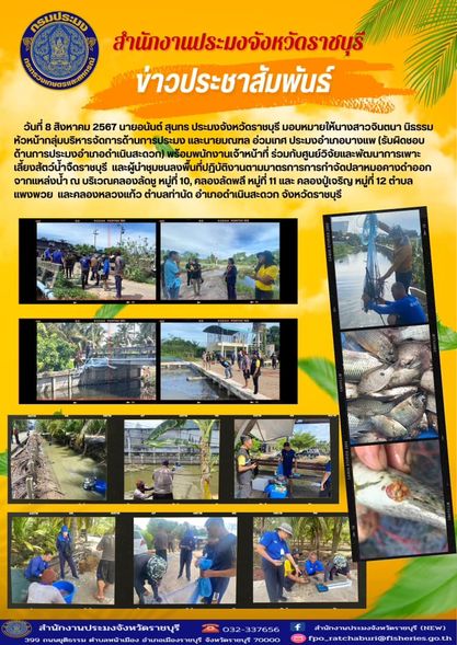 วันที่ 8 สิงหาคม 2567 นายอนันต์ สุนทร ประมงจังหวัดราชบุรี มอบหมายให้ นางสาวจินตนา นิธรรม หัวหน้ากลุ่มบริหารจัดการด้านการประมง และ นายมณฑล อ่วมเทศ ประมงอำเภอบางแพ (รับผิดชอบด้านการประมงอำเภอดำเนินสะดวก) พร้อมพนักงานเจ้าหน้าที่ ร่วมกับศูนย์วิจัยและพัฒนาการเพาะเลี้ยงสัตว์น้ำจืดราชบุรี และผู้นำชุมชน ลงพื้นที่ปฏิบัติงานตามมาตรการการกำจัดปลาหมอคางดำออกจากแหล่งน้ำ ณ บริเวณคลองลัดชู หมู่ที่ 10, คลองลัดพลี หมู่ที่ 11 และ คลองปู่เจริญ หมู่ที่ 12 ตำบลแพงพวย และคลองหลวงแก้ว ตำบลท่านัด อำเภอดำเนินสะดวก จังหวัดราชบุรี