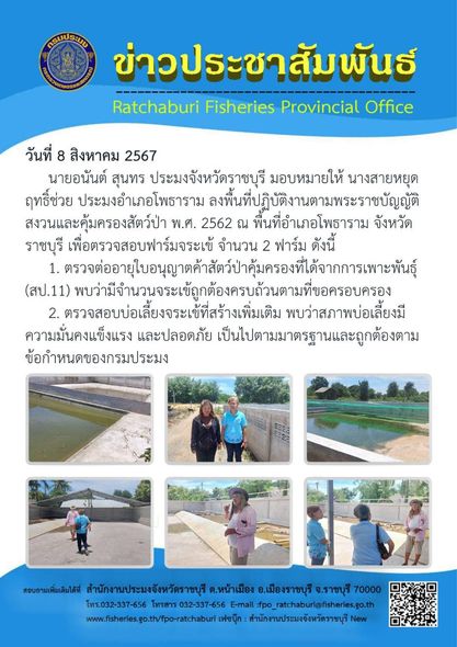 วันที่ 8 สิงหาคม 2567 นายอนันต์ สุนทร ประมงจังหวัดราชบุรี มอบหมายให้ นางสายหยุด ฤทธิ์ช่วย ประมงอำเภอโพธาราม ลงพื้นที่ปฏิบัติงานตามพระราชบัญญัติสงวนและคุ้มครองสัตว์ป่า พ.ศ. 2562 ณ พื้นที่อำเภอโพธาราม จังหวัดราชบุรี เพื่อตรวจสอบฟาร์มจระเข้ จำนวน 2 ฟาร์ม ดังนี้