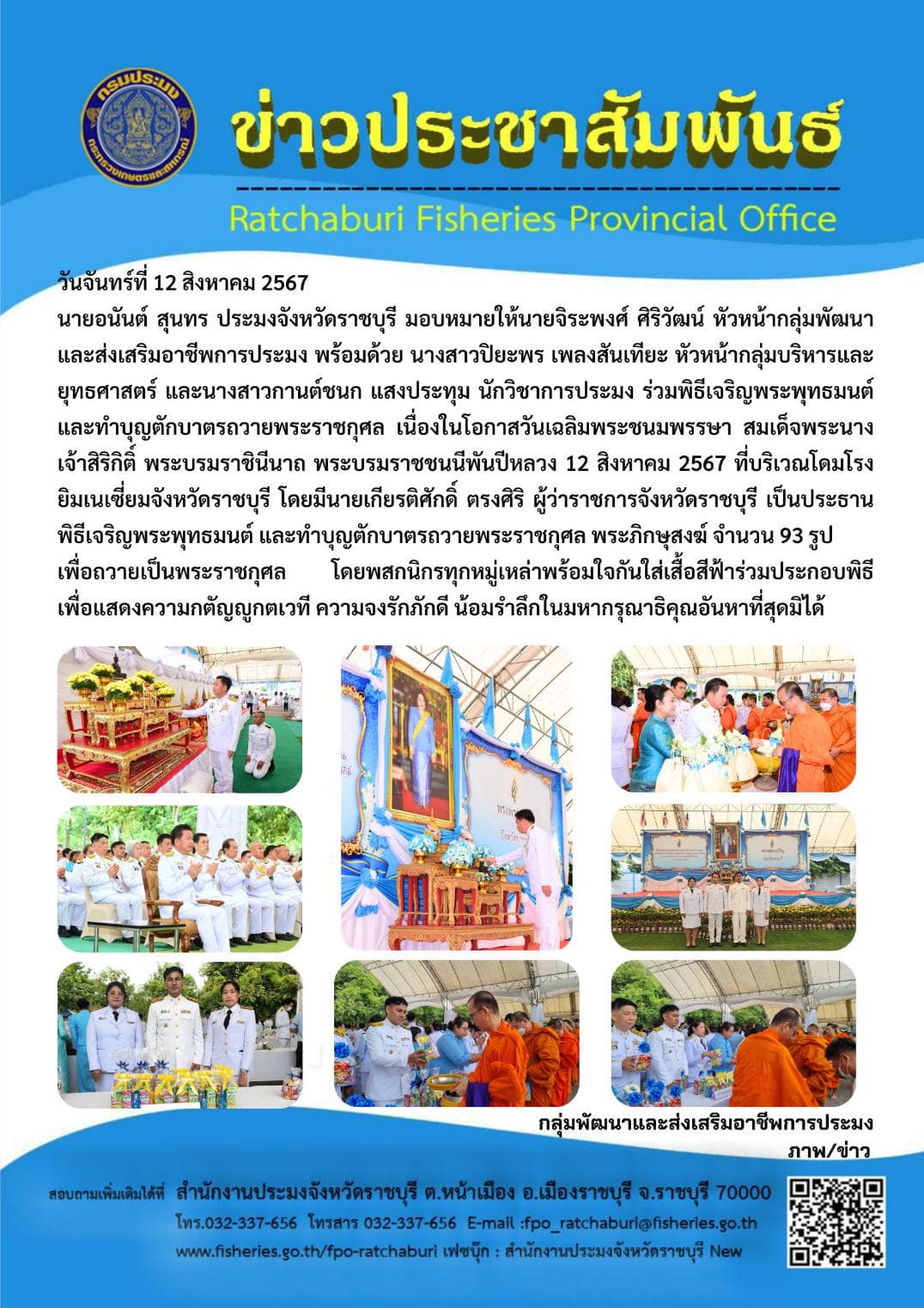 วันจันทร์ที่ 12 สิงหาคม 2567 นายอนันต์ สุนทร ประมงจังหวัดราชบุรี มอบหมายให้ นายจิระพงศ์ ศิริวัฒน์ หัวหน้ากลุ่มพัฒนาและส่งเสริมอาชีพการประมง พร้อมด้วย นางสาวปิยะพร เพลงสันเทียะ หัวหน้ากลุ่มบริหารและยุทธศาสตร์ และนางสาวกานต์ชนก แสงประทุม นักวิชาการประมง ร่วมพิธีเจริญพระพุทธมนต์ และทำบุญตักบาตรถวายพระราชกุศล เนื่องในโอกาสวันเฉลิมพระชนมพรรษา สมเด็จพระนางเจ้าสิริกิติ์ พระบรมราชินีนาถ พระบรมราชชนนีพันปีหลวง 12 สิงหาคม 2567 ที่บริเวณโดม โรงยิมเนเซี่ยมจังหวัดราชบุรี โดยมีนายเกียรติศักดิ์ ตรงศิริ ผู้ว่าราชการจังหวัดราชบุรี เป็นประธานพิธีเจริญพระพุทธมนต์ และทำบุญตักบาตรถวายพระราชกุศล พระภิกษุสงฆ์ จำนวน 93 รูป เพื่อถวายเป็นพระราชกุศล โดยพสกนิกรทุกหมู่เหล่าพร้อมใจกันใส่เสื้อสีฟ้าร่วมประกอบพิธี เพื่อแสดงความกตัญญูกตเวที ความจงรักภักดี น้อมรำลึกในมหากรุณาธิคุณอันหาที่สุดมิได้