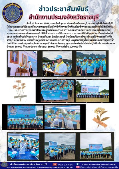 วันที่ 12 สิงหาคม 2567 นายอนันต์ สุนทร ประมงจังหวัดราชบุรี นางสาวสุรังษี ทัพพะรังสี ผู้อำนวยการศูนย์วิจัยและพัฒนาการเพาะเลี้ยงสัตว์น้ำจืดราชบุรี พร้อมด้วย ข้าราชการและเจ้าหน้าที่สังกัดกรมประมงในจังหวัดราชบุรี จัดพิธีปล่อยพันธุ์สัตว์น้ำและร่วมกิจกรรมจิตอาสาเฉลิมพระเกียรติเนื่องในวันเฉลิมพระชนมพรรษา สมเด็จพระนางเจ้าสิริกิติ์ พระบรมราชินีนาถ พระบรมราชชนนีพันปีหลวง และวันแม่แห่งชาติ 2567 ณ อ่างเก็บน้ำห้วยมะหาด อำเภอบ้านคา จังหวัดราชบุรี โดยมีนายปิยพงศ์ ชูวงศ์ รองผู้ว่าราชการจังหวัดราชบุรี เป็นประธาน พร้อมด้วยหัวหน้าส่วนราชการจังหวัดราชบุรี และประชาชนในพื้นที่ร่วมปล่อยพันธุ์สัตว์น้ำ โดยได้รับการสนับสนุนพันธุ์สัตว์น้ำจากศูนย์วิจัยและพัฒนาการเพาะเลี้ยงสัตว์น้ำจืดราชบุรีเป็นปลาตะเพียนขาวจำนวน 50,000 ตัว และปลาตะเพียนทอง 50,000 ตัว รวมทั้งสิ้น 100,000 ตัว