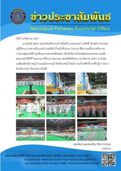 วันที่ 12 สิงหาคม 2567 นายอนันต์ สุนทร ประมงจังหวัดราชบุรี พร้อมกับ นายชานนท์ สรสิทธิ์ เจ้าพนักงานประมงปฏิบัติงาน นางสาวปรียาภรณ์ ธรรมโชติ เจ้าหน้าที่ประมง ร่วมพิธีถวายเครื่องราชสักการะ วางพานพุ่มและพิธีจุดเทียนถวายพระพรชัยมงคล เนื่องในโอกาสวันเฉลิมพระชนพรรษา สมเด็จพระนางเจ้าสิริกิติ์ พระบรมราชินีนาถ พระบรมราชชนนีพันปีหลวง 12 สิงหาคม 2567 ณ โรงยิมเนเซี่ยมจังหวัดราชบุรี อำเภอเมืองราชบุรี จังหวัดราชบุรี โดยมี นายเกียรติศักดิ์ ตรงศิริ ผู้ว่าราชการจังหวัดราชบุรี เป็นประธานในพิธี