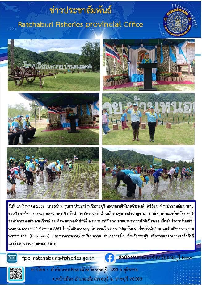 วันที่ 14 สิงหาคม 2567 นายอนันต์ สุนทร ประมงจังหวัดราชบุรี มอบหมายให้ นายจิระพงศ์ ศิริวัฒน์ หัวหน้ากลุ่มพัฒนาและส่งเสริมอาชีพการประมง และ นางสาวธิรารัตน์ หงษ์สงวนศรี เจ้าพนักงานธุรการชำนาญงาน สำนักงานประมงจังหวัดราชบุรี ร่วมกิจกรรมเฉลิมพระเกียรติ สมเด็จพระนางเจ้าสิริกิติ์ พระบรมราชินีนาถ พระบรมราชชนนีพันปีหลวง เนื่องในโอกาสวันเฉลิมพระชนมพรรษา 12 สิงหาคม 2567 โดยจัดกิจกรรมปลูกข้าวตามโครงการ “ปลูกวันแม่ เกี่ยววันพ่อ” ณ แหล่งผลิตอาหารตามพระราชดำริ (Foodbank) และธนาคารควาย/โรงเรียนควาย อำเภอสวนผึ้ง จังหวัดราชบุรี เพื่อร่วมแสดงความจงรักภักดี และสืบสานงานตามพระราชดำริ
