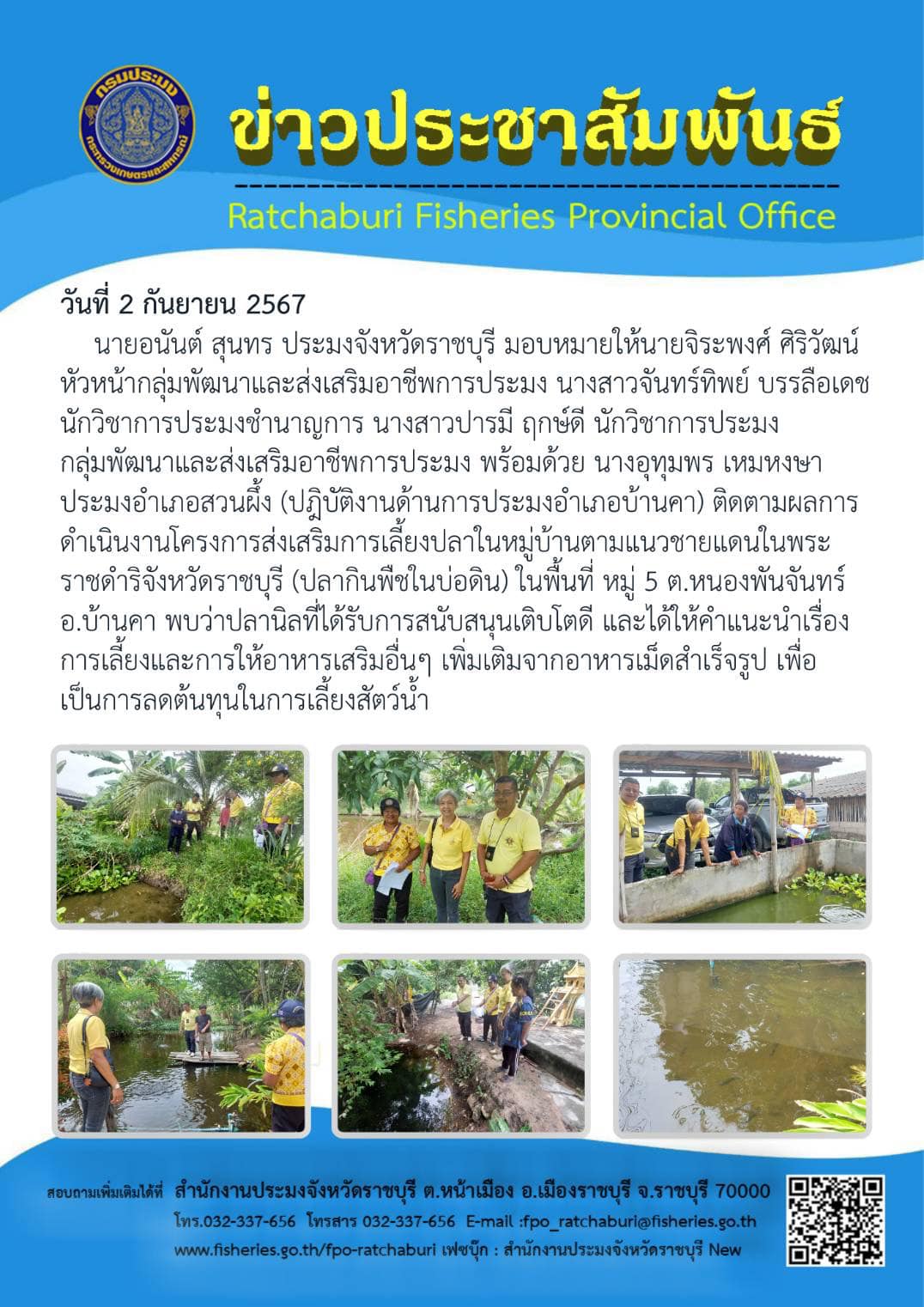 วันที่ 2 กันยายน 2567 นายอนันต์ สุนทร ประมงจังหวัดราชบุรี มอบหมายให้นายจิระพงศ์ ศิริวัฒน์ หัวหน้ากลุ่มพัฒนาและส่งเสริมอาชีพการประมง นางสาวจันทร์ทิพย์ บรรลือเดช นักวิชาการประมงชำนาญการ นางสาวปารมี ฤกษ์ดี นักวิชาการประมง กลุ่มพัฒนาและส่งเสริมอาชีพการประมง พร้อมด้วย นางอุทุมพร เหมหงษา ประมงอำเภอสวนผึ้ง (ปฎิบัติงานด้านการประมงอำเภอบ้านคา) ติดตามผลการดำเนินงานโครงการส่งเสริมการเลี้ยงปลาในหมู่บ้านตามแนวชายแดนในพระราชดำริจังหวัดราชบุรี (ปลากินพืชในบ่อดิน) ในพื้นที่ หมู่ 5 ต.หนองพันจันทร์ อ.บ้านคา พบว่าปลานิลที่ได้รับการสนับสนุนเติบโตดี และได้ให้คำแนะนำเรื่องการเลี้ยงและการให้อาหารเสริมอื่นๆ เพิ่มเติมจากอาหารเม็ดสำเร็จรูป เพื่อเป็นการลดต้นทุนในการเลี้ยงสัตว์น้ำ