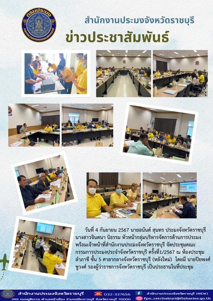 วันที่ 4 กันยายน 2567 นายอนันต์ สุนทร ประมงจังหวัดราชบุรี นางสาวจินตนา นิธรรม หัวหน้ากลุ่มบริหารจัดการด้านการประมง พร้อมเจ้าหน้าที่ สำนักงานประมงจังหวัดราชบุรี จัดประชุมคณะกรรมการประมงประจำจังหวัดราชบุรี ครั้งที่1/2567 ณ ห้องประชุมลำภาชี ชั้น 5 ศาลากลางจังหวัดราชบุรี (หลังใหม่) โดยมี นายปิยพงศ์ ชูวงศ์ รองผู้ว่าราชการจังหวัดราชบุรี เป็นประธานในที่ประชุม