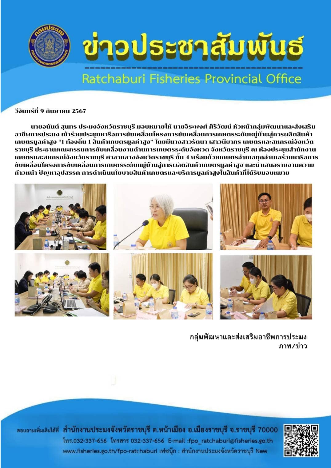 วันจันทร์ที่ 9 กันยายน 2567 นายอนันต์ สุนทร ประมงจังหวัดราชบุรี มอบหมายให้ นายจิระพงศ์ ศิริวัฒน์ หัวหน้ากลุ่มพัฒนาและส่งเสริมอาชีพการประมง เข้าร่วมประชุมหารือการขับเคลื่อนโครงการขับเคลื่อนการเกษตรระดับหมู่บ้านสู่การผลิตสินค้าเกษตรมูลค่าสูง “1 ท้องถิ่น 1 สินค้าเกษตรมูลค่าสูง” โดยมีนางสาวรัตนา เสาวนียากร เกษตรและสหกรณ์จังหวัดราชบุรี ประธานคณะกรรมการขับเคลื่อนงานด้านการเกษตรระดับจังหวด จังหวัดราชบุรี ณ ห้องประชุมสำนักงานเกษตรและสหกรณ์จังหวัดราชบุรี ศาลากลางจังหวัดราชบุรี ชั้น 4 พร้อมด้วยเกษตรอำเภอทุกอำเภอร่วมหารือการขับเคลื่อนโครงการขับเคลื่อนการเกษตรระดับหมู่บ้านสู่การผลิตสินค้าเกษตรมูลค่าสูง และนำเสนอรายงานความก้าวหน้า ปัญหาอุปสรรค การดำเนินนโยบายสินค้าเกษตรและบริการมูลค่าสูงในสินค้าที่ได้รับมอบหมาย