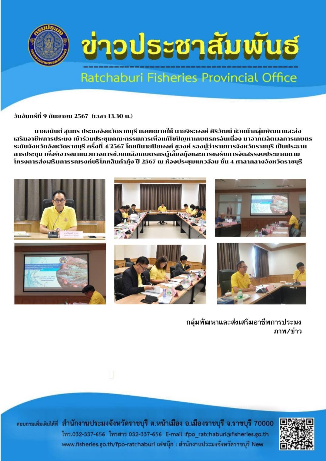 วันจันทร์ที่ 9 กันยายน 2567 (เวลา 13.30 น.) นายอนันต์ สุนทร ประมงจังหวัดราชบุรี มอบหมายให้ นายจิระพงศ์ ศิริวัฒน์ หัวหน้ากลุ่มพัฒนาและส่งเสริมอาชีพการประมง เข้าร่วมประชุมคณะกรรมการเพื่อแก้ไขปัญหาเกษตรกรอันเนื่อง มาจากผลิตผลการเกษตรระดับจังหวัดจังหวัดราชบุรี ครั้งที่ 4/2567 โดยมีนายปิยพงศ์ ชูวงศ์ รองผู้ว่าราชการจังหวัดราชบุรี เป็นประธานการประชุม เพื่อพิจารณาแนวทางการช่วยเหลือเกษตรกรผู้เลี้ยงกุ้งและการขอรับการจัดสรรงบประมาณตามโครงการส่งเสริมการรณรงค์บริโภคสินค้ากุ้ง ปี 2567 ณ ห้องประชุมแควอ้อม ชั้น 4 ศาลากลางจังหวัดราชบุรี