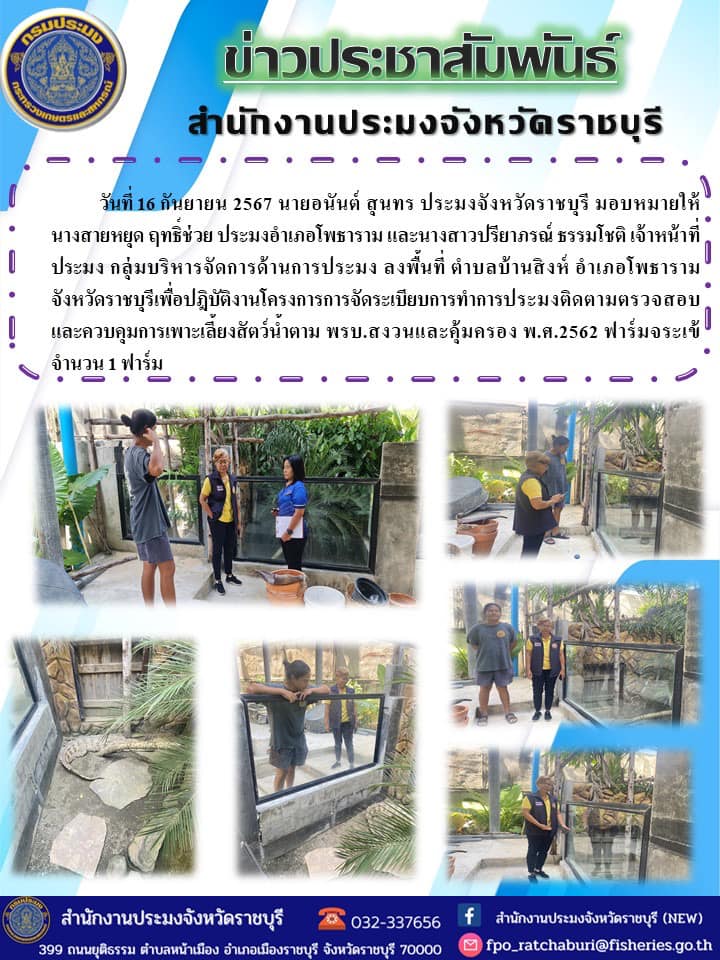 วันที่ 16 กันยายน 2567 นายอนันต์ สุนทร ประมงจังหวัดราชบุรี มอบหมายให้ นางสายหยุด ฤทธิ์ช่วย ประมงอำเภอโพธาราม และนางสาวปรียาภรณ์ ธรรมโชติ เจ้าหน้าที่ประมง กลุ่มบริหารจัดการด้านการประมง ลงพื้นที่ ตำบลบ้านสิงห์ อำเภอโพธาราม จังหวัดราชบุรี เพื่อปฎิบัติงานโครงการการจัดระเบียบการทำการประมงติดตามตรวจสอบและควบคุมการเพาะเลี้ยงสัตว์น้ำตาม พรบ.สงวนและคุ้มครอง พ.ศ.2562 ฟาร์มจระเข้ จำนวน 1 ฟาร์ม
