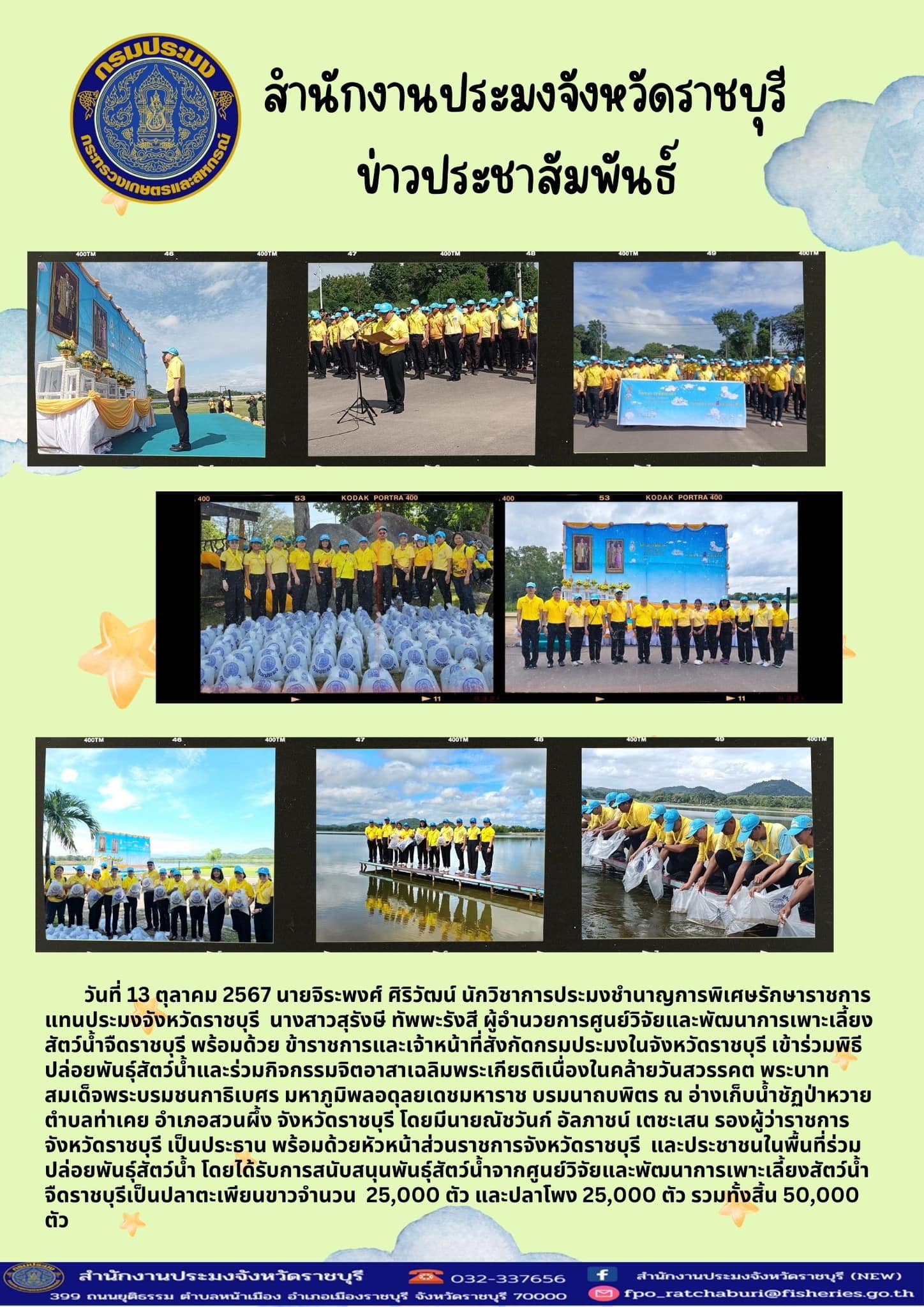 วันที่ 13 ตุลาคม 2567 นายจิระพงศ์ ศิริวัฒน์ นักวิชาการประมงชำนาญการพิเศษรักษาราชการแทนประมงจังหวัดราชบุรี นางสาวสุรังษี ทัพพะรังสี ผู้อำนวยการศูนย์วิจัยและพัฒนาการเพาะเลี้ยงสัตว์น้ำจืดราชบุรี พร้อมด้วย ข้าราชการและเจ้าหน้าที่สังกัดกรมประมงในจังหวัดราชบุรี เข้าร่วมพิธีปล่อยพันธุ์สัตว์น้ำและร่วมกิจกรรมจิตอาสาเฉลิมพระเกียรติเนื่องในคล้ายวันสวรรคต พระบาทสมเด็จพระบรมชนกาธิเบศร มหาภูมิพลอดุลยเดชมหาราช บรมนาถบพิตร ณ อ่างเก็บน้ำชัฏป่าหวาย ตำบลท่าเคย อำเภอสวนผึ้ง จังหวัดราชบุรี โดยมีนายณัชวันก์ อัลภาชน์ เตชะเสน รองผู้ว่าราชการจังหวัดราชบุรี เป็นประธาน พร้อมด้วยหัวหน้าส่วนราชการจังหวัดราชบุรี และประชาชนในพื้นที่ร่วมปล่อยพันธุ์สัตว์น้ำ โดยได้รับการสนับสนุนพันธุ์สัตว์น้ำจากศูนย์วิจัยและพัฒนาการเพาะเลี้ยงสัตว์น้ำจืดราชบุรีเป็นปลาตะเพียนขาวจำนวน 25,000 ตัว และปลาโพง 25,000 ตัว รวมทั้งสิ้น 50,000 ตัว