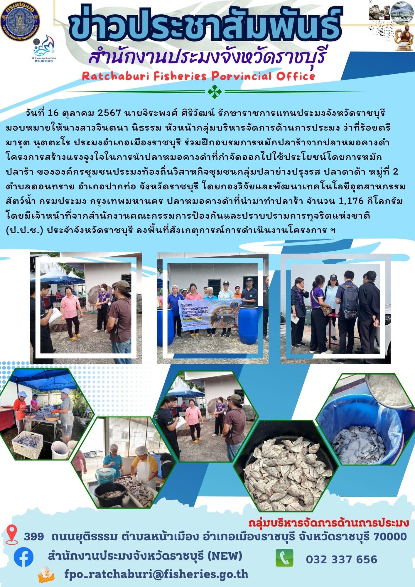 วันที่ 16 ตุลาคม 2567 นายจิระพงศ์ ศิริวัฒน์ รักษาราชการแทนประมงจังหวัดราชบุรี มอบหมายให้นางสาวจินตนา นิธรรม หัวหน้ากลุ่มบริหารจัดการด้านการประมง ว่าที่ร้อยตรีมารุต นุตตะโร ประมงอำเภอเมืองราชบุรี ร่วมฝึกอบรมการหมักปลาร้าจากปลาหมอคางดำ โครงการสร้างแรงจูงใจในการนำปลาหมอคางดำที่กำจัดออกไปใช้ประโยชน์โดยการหมักปลาร้า ขององค์กรชุมชนประมงท้องถิ่นวิสาหกิจชุมชนกลุ่มปลาย่างปรุงรส ปลาดาด้า หมู่ที่ 2 ตำบลดอนทราย อำเภอปากท่อ จังหวัดราชบุรี โดยกองวิจัยและพัฒนาเทคโนโลยีอุตสาหกรรมสัตว์น้ำ กรมประมง กรุงเทพมหานคร ปลาหมอคางดำที่นำมาทำปลาร้า จำนวน 1,176 กิโลกรัม โดยมีเจ้าหน้าที่จากสำนักงานคณะกรรมการป้องกันและปราบปรามการทุจริตแห่งชาติ (ป.ป.ช.) ประจำจังหวัดราชบุรี ลงพื้นที่สังเกตุการณ์การดำเนินงานโครงการฯ