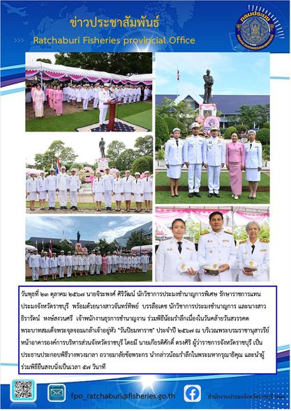 วันพุธที่ 23 ตุลาคม 2567 นายจิระพงศ์ ศิริวัฒน์ นักวิชาการประมงชำนาญการพิเศษ รักษาราชการแทนประมงจังหวัดราชบุรี พร้อมด้วย นางสาวจันทร์ทิพย์ บรรลือเดช นักวิชาการประมงชำนาญการ และนางสาวธิรารัตน์ หงษ์สงวนศรี เจ้าพนักงานธุรการชำนาญงาน ร่วมพิธีน้อมรำลึกเนื่องในวันคล้ายวันสวรรคตพระบาทสมเด็จพระจุลจอมเกล้าเจ้าอยู่หัว "วันปิยมหาราช" ประจำปี 2567 ณ บริเวณพระบรมราชานุสาวรีย์ หน้าอาคารองค์การบริหารส่วนจังหวัดราชบุรี โดยมี นายเกียรติศักดิ์ ตรงศิริ ผู้ว่าราชการจังหวัดราชบุรี เป็นประธานประกอบพิธีวางพวงมาลา ถวายมาลัยข้อพระกร นำกล่าวน้อมรำลึกในพระมหากรุณาธิคุณ และนำผู้ร่วมพิธียืนสงบนิ่งเป็นเวลา 57 วินาที