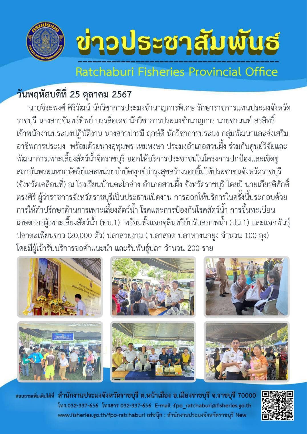 วันพฤหัสบดีที่ 25 ตุลาคม 2567 นายจิระพงศ์ ศิริวัฒน์ นักวิชาการประมงชำนาญการพิเศษ รักษาราชการแทนประมงจังหวัดราชบุรี นางสาวจันทร์ทิพย์ บรรลือเดช นักวิชาการประมงชำนาญการ นายชานนท์ สรสิทธิ์ เจ้าพนักงานประมงปฏิบัติงาน นางสาวปารมี ฤกษ์ดี นักวิชาการประมง กลุ่มพัฒนาและส่งเสริมอาชีพการประมง พร้อมด้วยนางอุทุมพร เหมหงษา ประมงอำเภอสวนผึ้ง ร่วมกับศูนย์วิจัยและพัฒนาการเพาะเลี้ยงสัตว์น้ำจืดราชบุรี ออกให้บริการประชาชนในโครงการปกป้องและเชิดชูสถาบันพระมหากษัตริย์และหน่วยบำบัดทุกข์บำรุงสุขสร้างรอยยิ้มให้ประชาชนจังหวัดราชบุรี (จังหวัดเคลื่อนที่) ณ โรงเรียนบ้านตะโกล่าง อำเภอสวนผึ้ง จังหวัดราชบุรี โดยมี นายเกียรติศักดิ์ ตรงศิริ ผู้ว่าราชการจังหวัดราชบุรีเป็นประธานเปิดงาน การออกให้บริการในครั้งนี้ประกอบด้วยการให้คำปรึกษาด้านการเพาะเลี้ยงสัตว์น้ำ โรคและการป้องกันโรคสัตว์น้ำ การขึ้นทะเบียนเกษตรกรผู้เพาะเลี้ยงสัตว์น้ำ (ทบ.1) พร้อมทั้งแจกจุลินทรีย์ปรับสภาพน้ำ (ปม.1) และแจกพันธุ์ปลาตะเพียนขาว (20,000 ตัว) ปลาสวยงาม ( ปลาสอด ปลาหางนกยูง จำนวน 100 ถุง) โดยมีผู้เข้ารับบริการขอคำแนะนำ และรับพันธุ์ปลา จำนวน 200 ราย
