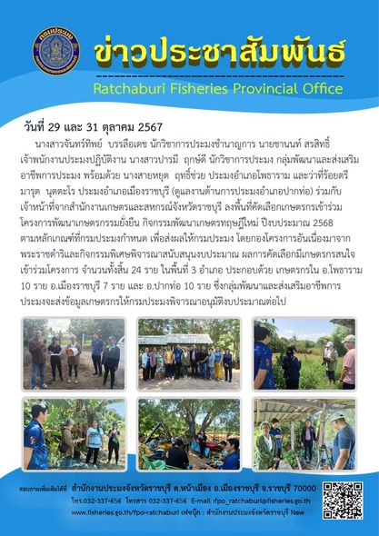 วันที่ 29 และ 31 ตุลาคม 2567 นางสาวจันทร์ทิพย์ บรรลือเดช นักวิชาการประมงชำนาญการ นายชานนท์ สรสิทธิ์ เจ้าพนักงานประมงปฏิบัติงาน นางสาวปารมี ฤกษ์ดี นักวิชาการประมง กลุ่มพัฒนาและส่งเสริมอาชีพการประมง พร้อมด้วย นางสายหยุด ฤทธิ์ช่วย ประมงอำเภอโพธาราม และว่าที่ร้อยตรีมารุต นุตตะโร ประมงอำเภอเมืองราชบุรี (ดูแลงานด้านการประมงอำเภอปากท่อ) ร่วมกับเจ้าหน้าที่จากสำนักงานเกษตรและสหกรณ์จังหวัดราชบุรี ลงพื้นที่คัดเลือกเกษตรกรเข้าร่วมโครงการพัฒนาเกษตรกรรมยั่งยืน กิจกรรมพัฒนาเกษตรทฤษฎีใหม่ ปีงบประมาณ 2568 ตามหลักเกณฑ์ที่กรมประมงกำหนด เพื่อส่งผลให้กรมประมง โดยกองโครงการอันเนื่องมาจากพระราชดำริและกิจกรรมพิเศษพิจารณาสนับสนุนงบประมาณ ผลการคัดเลือกมีเกษตรกรสนใจเข้าร่วมโครงการ จำนวนทั้งสิ้น 24 ราย ในพื้นที่ 3 อำเภอ ประกอบด้วย เกษตรกรใน อ.โพธาราม 10 ราย อ.เมืองราชบุรี 7 ราย และ อ.ปากท่อ 10 ราย ซึ่งกลุ่มพัฒนาและส่งเสริมอาชีพการประมงจะส่งข้อมูลเกษตรกรให้กรมประมงพิจารณาอนุมัติงบประมาณต่อไป
