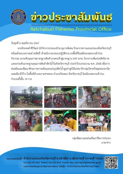 วันพุธที่ 6 พฤศจิกายน 2567 นายจิระพงศ์ ศิริวัฒน์ นักวิชาการประมงชำนาญการพิเศษ รักษาราชการแทนประมงจังหวัดราชบุรี พร้อมด้วยนายชานนท์ สรสิทธิ์ เจ้าพนักงานประมงปฏิบัติงาน ลงพื้นที่รับสมัครเกษตรกร เข้าร่วมกิจกรรม ยกระดับคุณภาพมาตรฐานสินค้าเกษตรเข้าสู่มาตรฐาน GAP มกษ. โครงการเพิ่มประสิทธิภาพเเละยกระดับมาตรฐานคุณภาพสินค้าสัตว์น้ำในจังหวัดราชบุรี ประจำปีงบประมาณ พ.ศ. 2568 เพื่อการส่งเสริมและพัฒนาศักยภาพการผลิตและแปรรูปสัตว์น้ำมูลค่าสูงให้แก่สมาชิกกลุ่มวิสาหกิจชุมชนปลานิลแดดเดียวไร้ก้าง ในพื้นที่ตำบลเกาะศาลพระ อำเภอวัดเพลง จังหวัดราชบุรี โดยมีเกษตรกรเข้าร่วม จำนวนทั้งสิ้น 14 ราย
