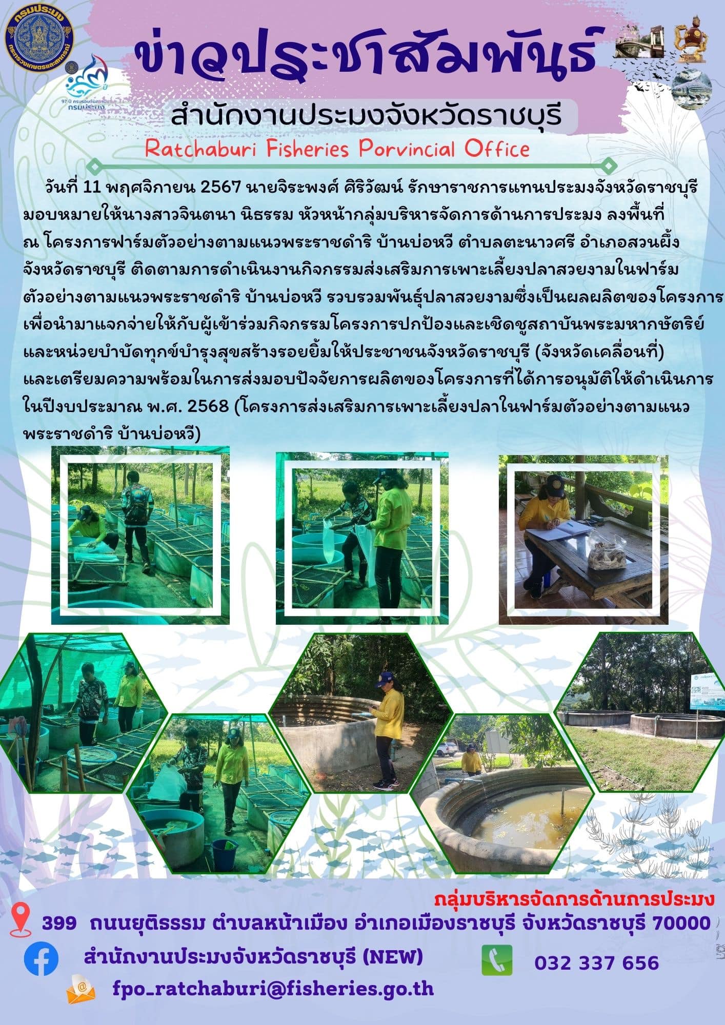 วันที่ 11 พฤศจิกายน 2567 นายจิระพงศ์ ศิริวัฒน์ นักวิชาการปะมงชำนาญการพิเศษ รักษาราชการแทนประมงจังหวัดราชบุรี มอบหมายให้ นางสาวจินตนา นิธรรม หัวหน้ากลุ่มบริหารจัดการด้านการประมง ลงพื้นที่ ณ โครงการฟาร์มตัวอย่างตามแนวพระราชดำริ บ้านบ่อหวี ตำบลตะนาวศรี อำเภอสวนผึ้ง จังหวัดราชบุรี ติดตามการดำเนินงานกิจกรรมส่งเสริมการเพาะเลี้ยงปลาสวยงามในฟาร์มตัวอย่างตามแนวพระราชดำริ บ้านบ่อหวี รวบรวมพันธุ์ปลาสวยงามซึ่งเป็นผลผลิตของโครงการ เพื่อนำมาแจกจ่ายให้กับผู้เข้าร่วมกิจกรรมโครงการปกป้องและเชิดชูสถาบันพระมหากษัตริย์และหน่วยบำบัดทุกข์บำรุงสุขสร้างรอยยิ้มให้ประชาชนจังหวัดราชบุรี (จังหวัดเคลื่อนที่) และเตรียมความพร้อมในการส่งมอบปัจจัยการผลิตของโครงการที่ได้การอนุมัติให้ดำเนินการในปีงบประมาณ พ.ศ. 2568 (โครงการส่งเสริมการเพาะเลี้ยงปลาในฟาร์มตัวอย่างตามแนวพระราชดำริ บ้านบ่อหวี