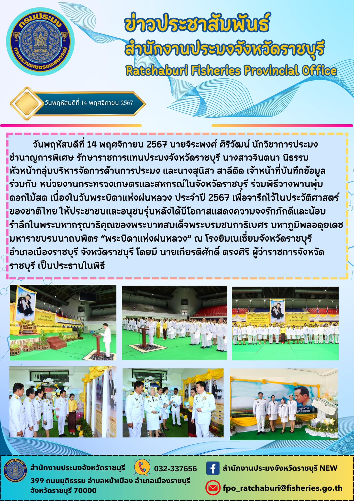 วันพฤหัสบดีที่ 14 พฤศจิกายน 2567 นายจิระพงศ์ ศิริวัฒน์ นักวิชาการประมงชำนาญการพิเศษ รักษาราชการแทนประมงจังหวัดราชบุรี นางสาวจินตนา นิธรรม หัวหน้ากลุ่มบริหารจัดการด้านการประมง และนางสุนิสา สาลีติด เจ้าหน้าที่บันทึกข้อมูล ร่วมกับ หน่วยงานกระทรวงเกษตรและสหกรณ์ในจังหวัดราชบุรี ร่วมพิธีวางพานพุ่มดอกไม้สด เนื่องในวันพระบิดาแห่งฝนหลวง ประจำปี 2567 เพื่อจารึกไว้ในประวัติศาสตร์ของชาติไทยให้ประชาชนและอนุชนรุ่นหลังได้มีโอกาสแสดงความจงรักภักดีและน้อมรำลึกในพระมหากรุณาธิคุณของพระบาทสมเด็จพระบรมชนกาธิเบศร มหาภูมิพลอดุยเดชมหาราชบรมนาถบพิตร “พระบิดาแห่งฝนหลวง” ณ โรงยิมเนเซี่ยมจังหวัดราชบุรี อำเภอเมืองราชบุรี จังหวัดราชบุรี โดยมี นายเกียรติศักดิ์ ตรงศิริ ผู้ว่าราชการจังหวัดราชบุรี เป็นประธานในพิธี