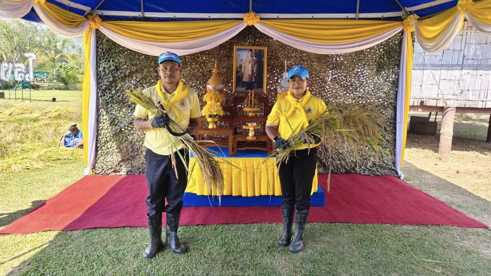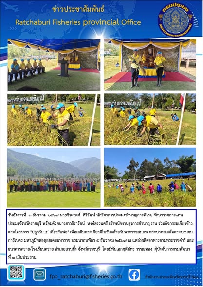 วันอังคารที่ 3 ธันวาคม 2567 นายจิระพงศ์ ศิริวัฒน์ นักวิชาการประมงชำนาญการพิเศษ รักษาราชการแทน ประมงจังหวัดราชบุรี พร้อมด้วยนางสาวธิรารัตน์ หงษ์สงวนศรี เจ้าพนักงานธุรการชำนาญงาน ร่วมกิจกรรมเกี่ยวข้าวตามโครงการ "ปลูกวันแม่ เกี่ยววันพ่อ" เพื่อเฉลิมพระเกียรติในวันคล้ายวันพระราชสมภพ พระบาทสมเด็จพระบรมชนกาธิเบศร มหาภูมิพลอดุลยเดชมหาราช บรมนาถบพิตร 5 ธันวาคม 2567 ณ แหล่งผลิตอาหารตามพระราชดำริ และธนาคารควาย/โรงเรียนควาย อำเภอสวนผึ้ง จังหวัดราชบุรี โดยมีพันเอกชุติภัทร วรรณทอง ผู้บังคับการกรมพัฒนาที่ 1 เป็นประธาน