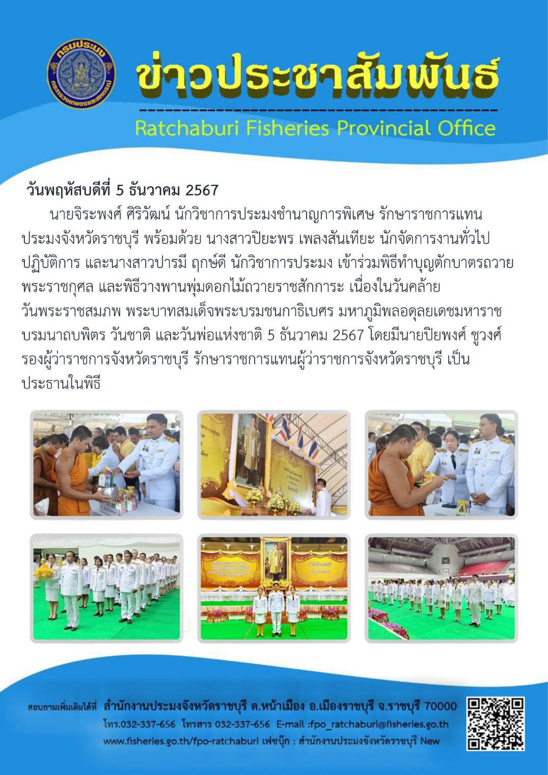 วันพฤหัสบดีที่ 5 ธันวาคม 2567 นายจิระพงศ์ ศิริวัฒน์ นักวิชาการประมงชำนาญการพิเศษ รักษาราชการแทนประมงจังหวัดราชบุรี พร้อมด้วย นางสาวปิยะพร เพลงสันเทียะ นักจัดการงานทั่วไปปฏิบัติการ และนางสาวปารมี ฤกษ์ดี นักวิชาการประมง เข้าร่วมพิธีทำบุญตักบาตรถวายพระราชกุศล และพิธีวางพานพุ่มดอกไม้ถวายราชสักการะ เนื่องในวันคล้ายวันพระราชสมภพ พระบาทสมเด็จพระบรมชนกาธิเบศร มหาภูมิพลอดุลยเดชมหาราช บรมนาถบพิตร วันชาติ และวันพ่อแห่งชาติ 5 ธันวาคม 2567 โดยมีนายปิยพงศ์ ชูวงศ์ รองผู้ว่าราชการจังหวัดราชบุรี รักษาราชการแทนผู้ว่าราชการจังหวัดราชบุรี เป็นประธานในพิธี