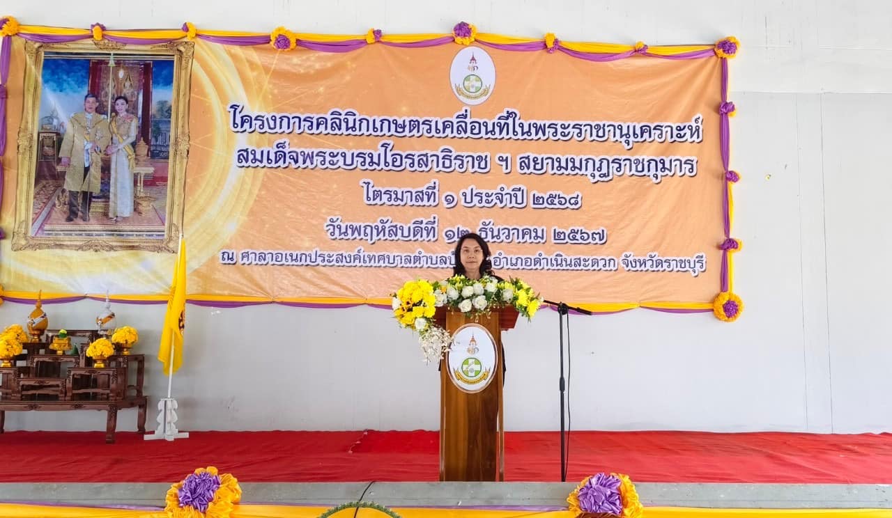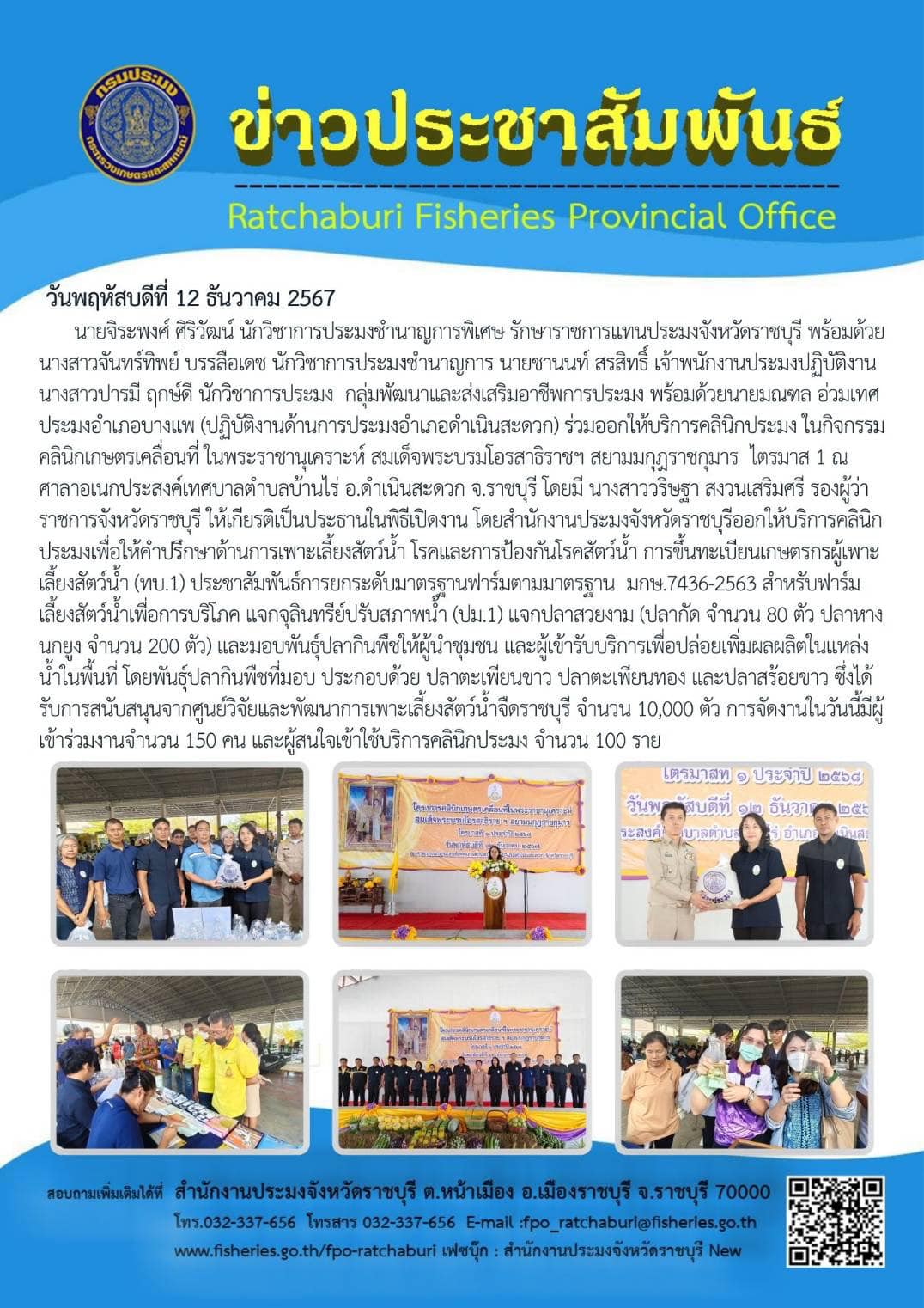 วันพฤหัสบดีที่ 12 ธันวาคม 2567 นายจิระพงศ์ ศิริวัฒน์ นักวิชาการประมงชำนาญการพิเศษ รักษาราชการแทนประมงจังหวัดราชบุรี พร้อมด้วยนางสาวจันทร์ทิพย์ บรรลือเดช นักวิชาการประมงชำนาญการ นายชานนท์ สรสิทธิ์ เจ้าพนักงานประมงปฏิบัติงาน นางสาวปารมี ฤกษ์ดี นักวิชาการประมง กลุ่มพัฒนาและส่งเสริมอาชีพการประมง พร้อมด้วยนายมณฑล อ่วมเทศ ประมงอำเภอบางแพ (ปฏิบัติงานด้านการประมงอำเภอดำเนินสะดวก) ร่วมออกให้บริการคลินิกประมง ในกิจกรรมคลินิกเกษตรเคลื่อนที่ ในพระราชานุเคราะห์ สมเด็จพระบรมโอรสาธิราชฯ สยามมกุฎราชกุมาร ไตรมาส 1 ณ ศาลาอเนกประสงค์เทศบาลตำบลบ้านไร่ อ.ดำเนินสะดวก จ.ราชบุรี โดยมี นางสาววริษฐา สงวนเสริมศรี รองผู้ว่าราชการจังหวัดราชบุรี ให้เกียรติเป็นประธานในพิธีเปิดงาน โดยสำนักงานประมงจังหวัดราชบุรีออกให้บริการคลินิกประมงเพื่อให้คำปรึกษาด้านการเพาะเลี้ยงสัตว์น้ำ โรคและการป้องกันโรคสัตว์น้ำ การขึ้นทะเบียนเกษตรกรผู้เพาะเลี้ยงสัตว์น้ำ (ทบ.1) ประชาสัมพันธ์การยกระดับมาตรฐานฟาร์มตามมาตรฐาน มกษ.7436-2563 สำหรับฟาร์มเลี้ยงสัตว์น้ำเพื่อการบริโภค แจกจุลินทรีย์ปรับสภาพน้ำ (ปม.1) แจกปลาสวยงาม (ปลากัด จำนวน 80 ตัว ปลาหางนกยูง จำนวน 200 ตัว) และมอบพันธุ์ปลากินพืชให้ผู้นำชุมชน และผู้เข้ารับบริการเพื่อปล่อยเพิ่มผลผลิตในแหล่งน้ำในพื้นที่ โดยพันธุ์ปลากินพืชที่มอบ ประกอบด้วย ปลาตะเพียนขาว ปลาตะเพียนทอง และปลาสร้อยขาว ซึ่งได้รับการสนับสนุนจากศูนย์วิจัยและพัฒนาการเพาะเลี้ยงสัตว์น้ำจืดราชบุรี จำนวน 10,000 ตัว การจัดงานในวันนี้มีผู้เข้าร่วมงานจำนวน 150 คน และผู้สนใจเข้าใช้บริการคลินิกประมง จำนวน 100 ราย