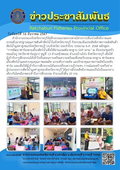 วันจันทร์ที่ 16 ธันวาคม 2567 สำนักงานประมงจังหวัดราชบุรี จัดฝึกอบรมเกษตรกรตามโครงการเพิ่มประสิทธิภาพและยกระดับมาตรฐานคุณภาพสินค้าสัตว์น้ำในจังหวัดราชบุรี กิจกรรมเพิ่มประสิทธิภาพการผลิตสินค้าสัตว์น้ำมูลค่าสูงของจังหวัดราชบุรี (งบจังหวัด) ประจำปีงบ ประมาณ พ.ศ. 2568 หลักสูตร “การพัฒนาฟาร์มเพาะเลี้ยงสัตว์น้ำเพื่อให้ผ่านเกณฑ์มาตรฐาน GAP มกษ." ณ ห้องประชุมครัวหอมมันปู (ฟาริดาฟาร์มปูนา) หมู่ที่ 13 ตำบลคุ้งพยอม อำเภอบ้านโป่ง จังหวัดราชบุรี เพื่อให้ผู้เข้ารับการฝึกอบรมได้เข้าใจขั้นตอนการเตรียมความพร้อมเพื่อขอรับรองมาตรฐาน ฟาร์มเพาะเลี้ยงสัตว์น้ำและควบคุมคุณภาพผลผลิต ยกระดับการผลิต และรักษาคุณภาพการผลิตในระดับฟาร์ม และเพื่อให้ผู้เข้ารับการฝึกอบรมได้แลกเปลี่ยนความรู้ประสบ การณ์และสร้างเครือข่ายผู้ประกอบการสัตว์น้ำมูลค่าสูงของจังหวัดราชบุรี ได้อย่างมีประสิทธิภาพและเป็นไปในแนวทางเดียวกันโดยมีเกษตรเข้ารับการฝึกอบรม จำนวนทั้งสิ้น 20 ราย