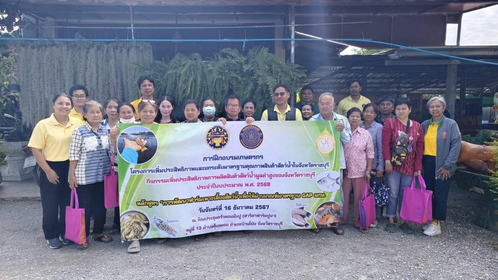 จัดฝึกอบรมเกษตรกรตามโครงการเพิ่มประสิทธิภาพและยกระดับมาตรฐานคุณภาพสินค้าสัตว์น้ำในจังหวัดราชบุรี กิจกรรมเพิ่มประสิทธิภาพการผลิตสินค้าสัตว์น้ำมูลค่าสูงของจังหวัดราชบุรี (งบจังหวัด) ประจำปีงบ ประมาณ พ.ศ. 2568