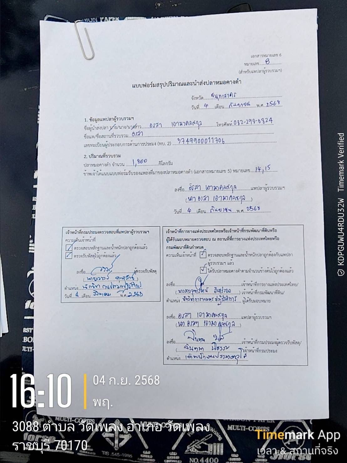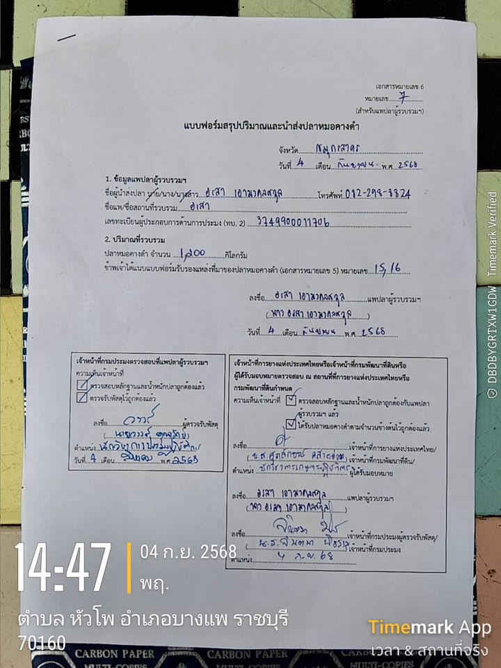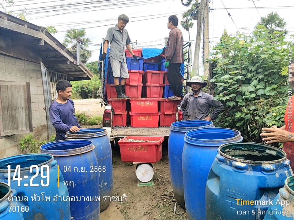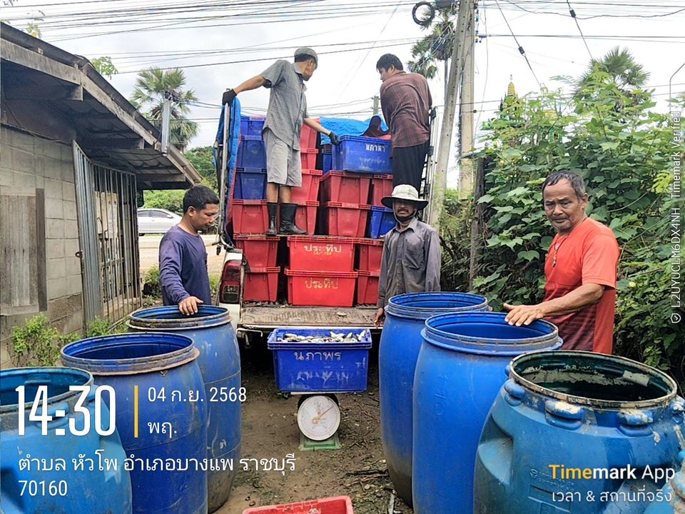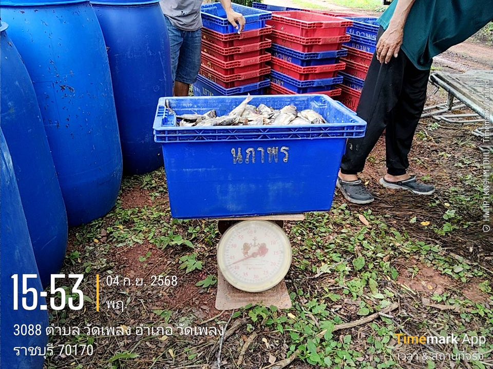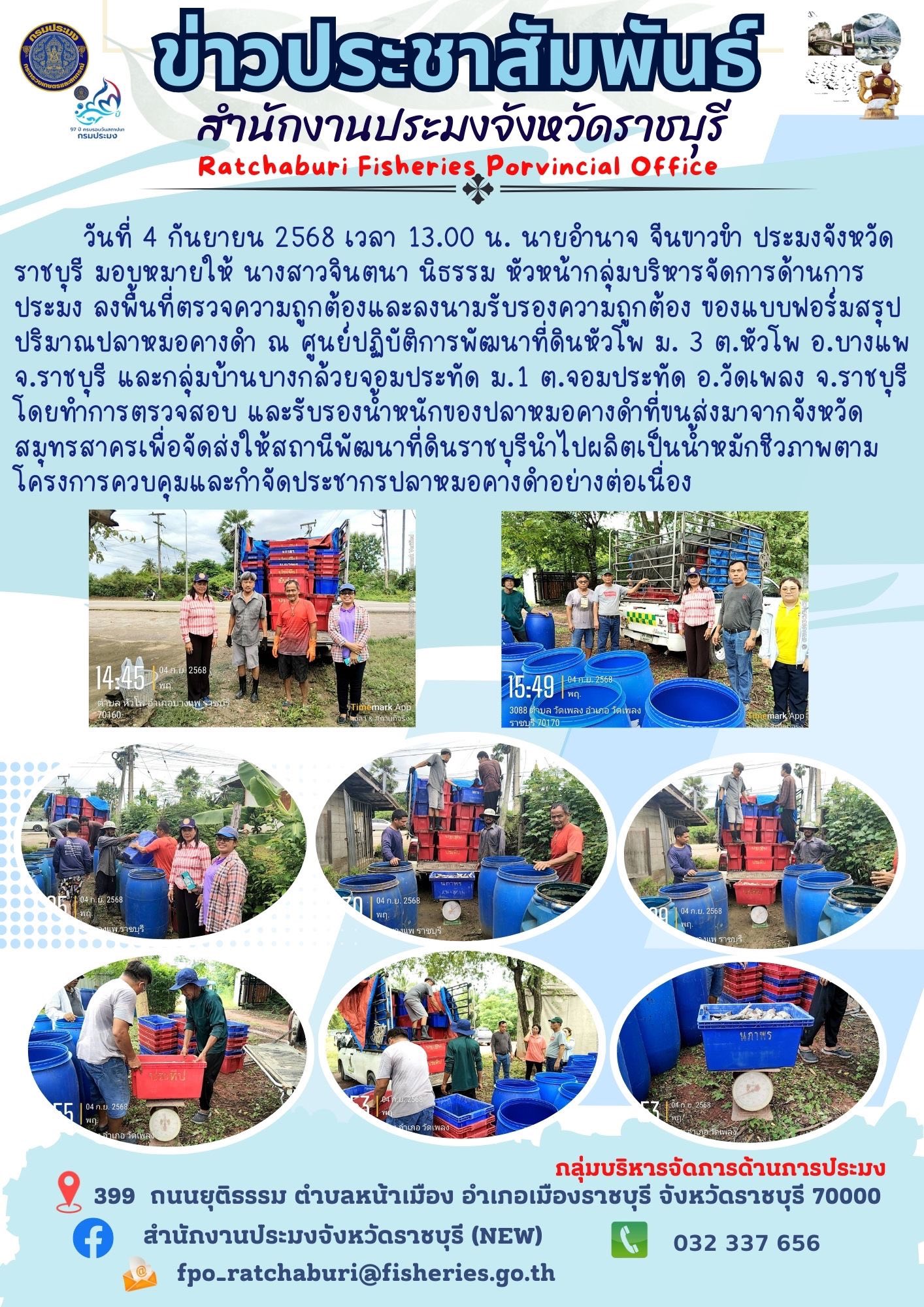 วันที่ 4 กันยายน 2568 เวลา 13.00 น. นายอำนาจ จีนขาวขำ ประมงจังหวัดราชบุรี มอบหมายให้ นางสาวจินตนา นิธรรม หัวหน้ากลุ่มบริหารจัดการด้านการประมง ลงพื้นที่ตรวจความถูกต้องและลงนามรับรองความถูกต้อง ของแบบฟอร์มสรุปปริมาณปลาหมอคางดำ ณ ศูนย์ปฏิบัติการพัฒนาที่ดินหัวโพ หมู่ 3 ต.หัวโพ อ.บางแพ จ.ราชบุรี และกลุ่มบ้านบางกล้วยจอมประทัด ม.1 ต.จอมประทัด อ.วัดเพลง จ.ราชบุรี โดยทำการตรวจสอบ และรับรองน้ำหนักของปลาหมอคางดำที่ขนส่งมาจากจังหวัดสมุทรสาครเพื่อจัดส่งให้สถานีพัฒนาที่ดินราชบุรีนำไปผลิตเป็นน้ำหมักชีวภาพตามโครงการควบคุมและกำจัดประชากรปลาหมอคางดำอย่างต่อเนื่อง